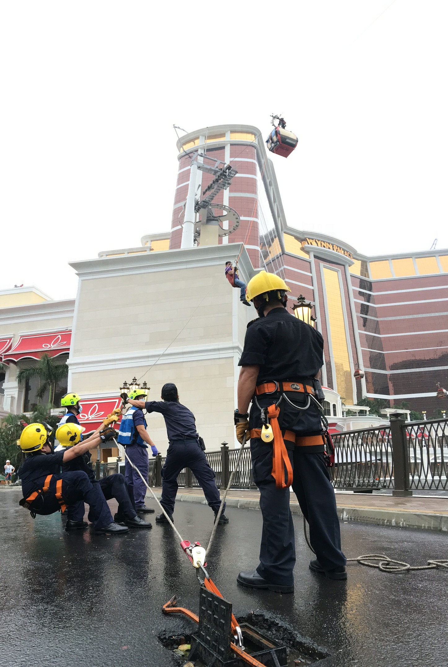 O Corpo de Bombeiros (CB) realizou, hoje (dia 12 de Agosto de 2016), na parte da manhã, em conjunto com o Wynn Palace, um simulacro de salvamento no sistema de teleférico, que serve para testar as medidas de contingência e a coordenação e comunicação entre ambas as partes, em caso de acidentes.