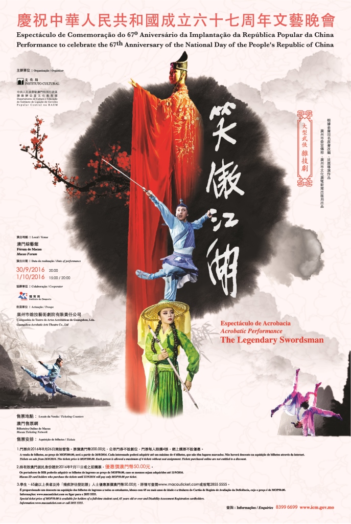 A fim de comemorar o 67.º aniversário da implantação da República Popular da China, o Instituto Cultural co-organiza com o Departamento de Cultura e Educação do Gabinete de Ligação do Governo Popular Central na RAEM, em cooperação com o Instituto do Desporto, o “Espectáculo Comemorativo do 67.º Aniversário da Implantação da República Popular da China”, convidando para a ocasião a Companhia de Teatro de Artes Acrobáticas de Guangzhou para apresentar o Espectáculo de Acrobacia “The Legendary Swordsman”. O espectáculo será apresentado em três sessões, a ter lugar nos dias 30 de Setembro, pelas 20:00 horas, e 1 de Outubro, pelas 15:00 e pelas 20:00 horas, no Fórum de Macau. Os bilhetes para o espectáculo encontram-se à venda na Bilheteira Online de Macau a partir de Sexta-feira (26 de Agosto).