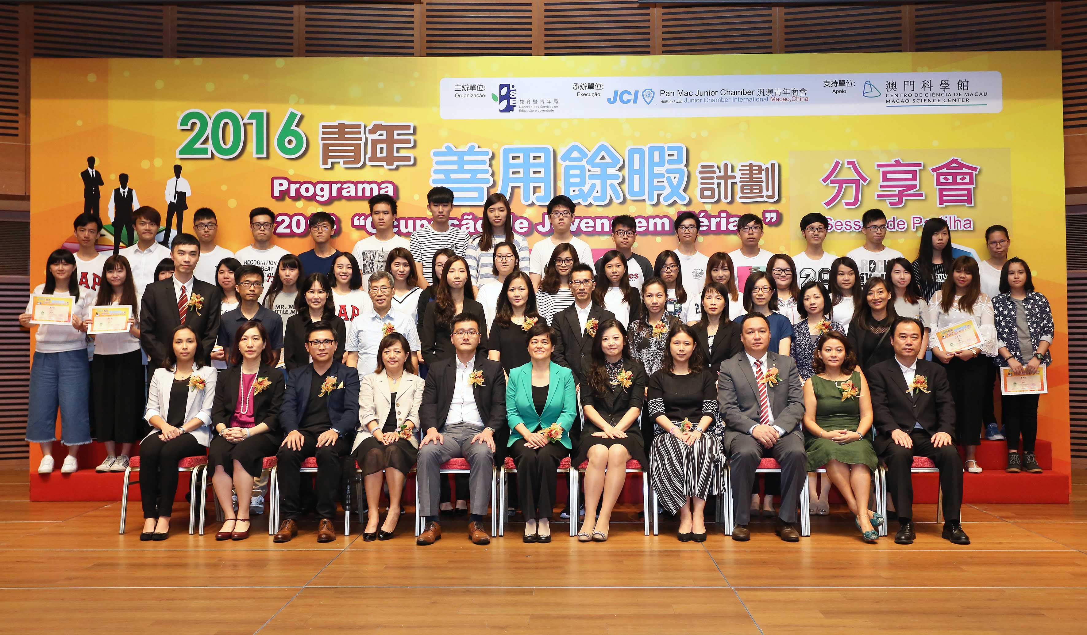 Em articulação com a “Política de Juventude de Macau” na sua vertente de “promoção da mobilidade social” e, em paralelo, com o reforço dos trabalhos de aconselhamento de carreira para os jovens, realizou-se, com sucesso, o Programa “Ocupação de Jovens em Férias 2016”, organizado pelo pela Direcção dos Serviços de Educação e Juventude (DSEJ) em colaboração com a Associação de Jovens Empresários Pan Mac, contando, ainda, com apoio do Centro de Ciência de Macau, S.A. e com participação conjunta de 36 serviços públicos e instituições particulares de Macau. O referido programa atraiu a inscrição de 1.558 jovens, tendo sido analisados e seleccionados, para nele participarem, 438 jovens. Os participantes participaram numa série de formações e actividades de estágio sobre planeamento da carreira. O Programa iniciou-se em 2 de Julho e terminou no dia 26 de Agosto. Para agradecer a todas instituições participantes e para atribuir certificados de mérito aos excelentes estagiários do Programa, foi realizada, pelo organizador, a sessão de partilha no dia 27 de Agosto (sábado), pelas 15h00, no Centro de Convenções do Centro de Ciência de Macau.