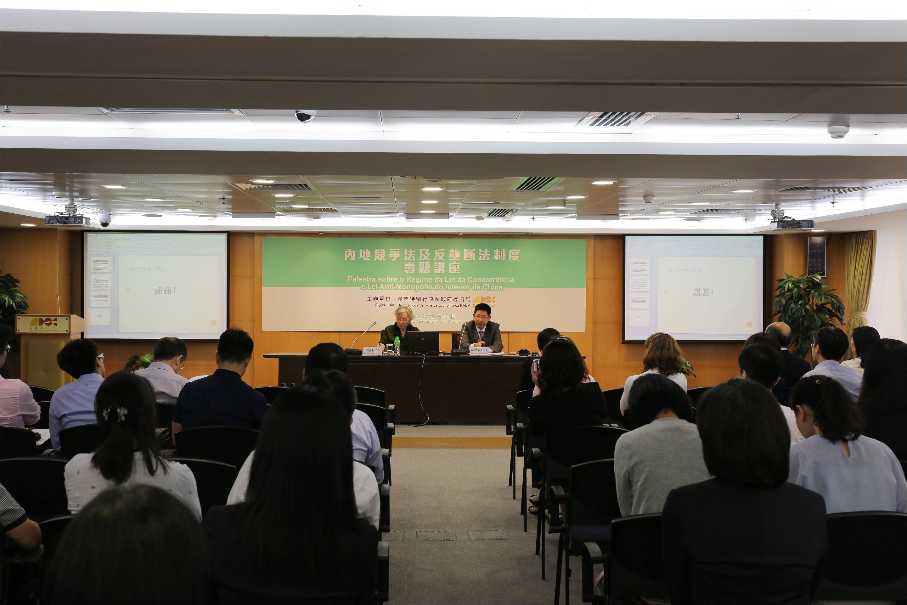 Para participar na Palestra, foram convidados dois académicos distintos, considerados autoridades do Interior da China na área da Lei da Concorrência e da Lei Anti-Monopólio, o Professor Wang Xiaoye, Doutor em Direito pela Universidade de Hamburgo, Alemanha, Investigador do Instituto de Estudos de Direito da Academia de Ciências Sociais da China, e o Dr. Li Honglei, Coordenador do Instituto de Direito Constitucional e Direito Administrativo da Academia de Ciências Sociais da China, que procederam à apresentação de vários temas relacionados com a Lei Anti-Monopólio do Interior da China, nomeadamente elaboração e aplicação, problemas enfrentados na sua aplicação e perspectivas do seu aperfeiçoamento, bem como mecanismos, medidas e resultados da implementação da lei da concorrência, perspectivas de evolução futura, entre outros. O Professor Wang Xiaoye considerou que a Lei Anti-Monopólio do Interior da China já se tornou uma das leis anti-monopólio com mais impacto no mundo, graças à reforma do sistema económico da China, a Lei Anti-Monopólio tem cada vez um papel mais importante no sistema jurídico da China. O Dr. Li Honglei referiu que a Lei da Concorrência do Interior da China se encontra, de momento, a ser revista, visando reforçar a Lei e harmonizar-se com outras legislações.