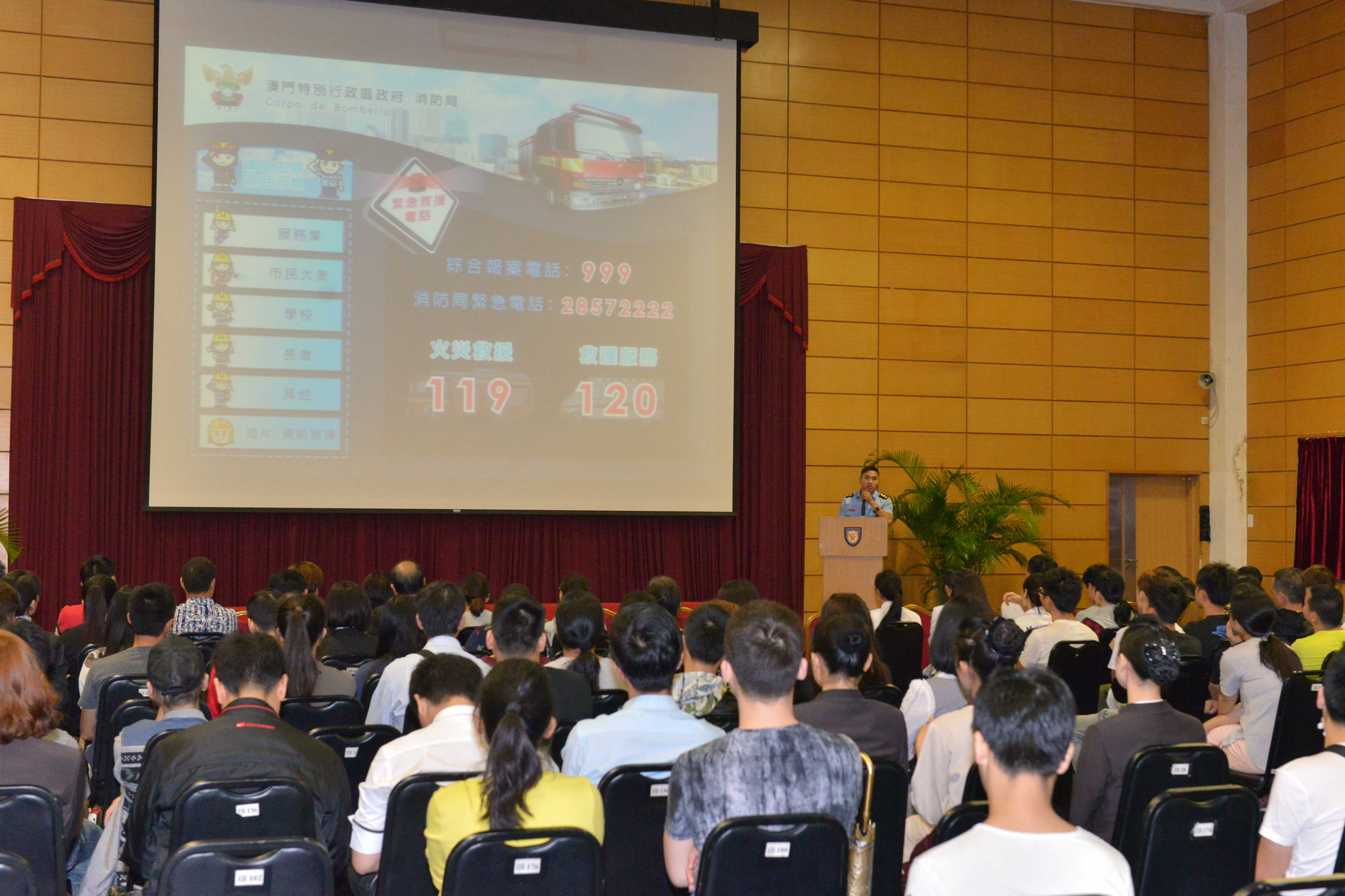 A palestra de conhecimentos sobre segurança contra incêndios teve lugar no dia 18 de Outubro, no Comando e Posto Operacional do Lago Sai Van, que contou com um total de 120 participantes. O conteúdo da palestra engloba a apresentação da missão, dos valores e da visão do CB, a teoria da combustão, as crises mais comuns em incêndios, as medidas de contingência a adoptar em caso de fogo, as técnicas de evacuação, a apresentação das instalações e equipamentos de prevenção contra incêndios, o método de manutenção dos sistemas diários de protecção contra incêndios e o uso correcto e seguro dos extintores e sarilhos de mangueira.