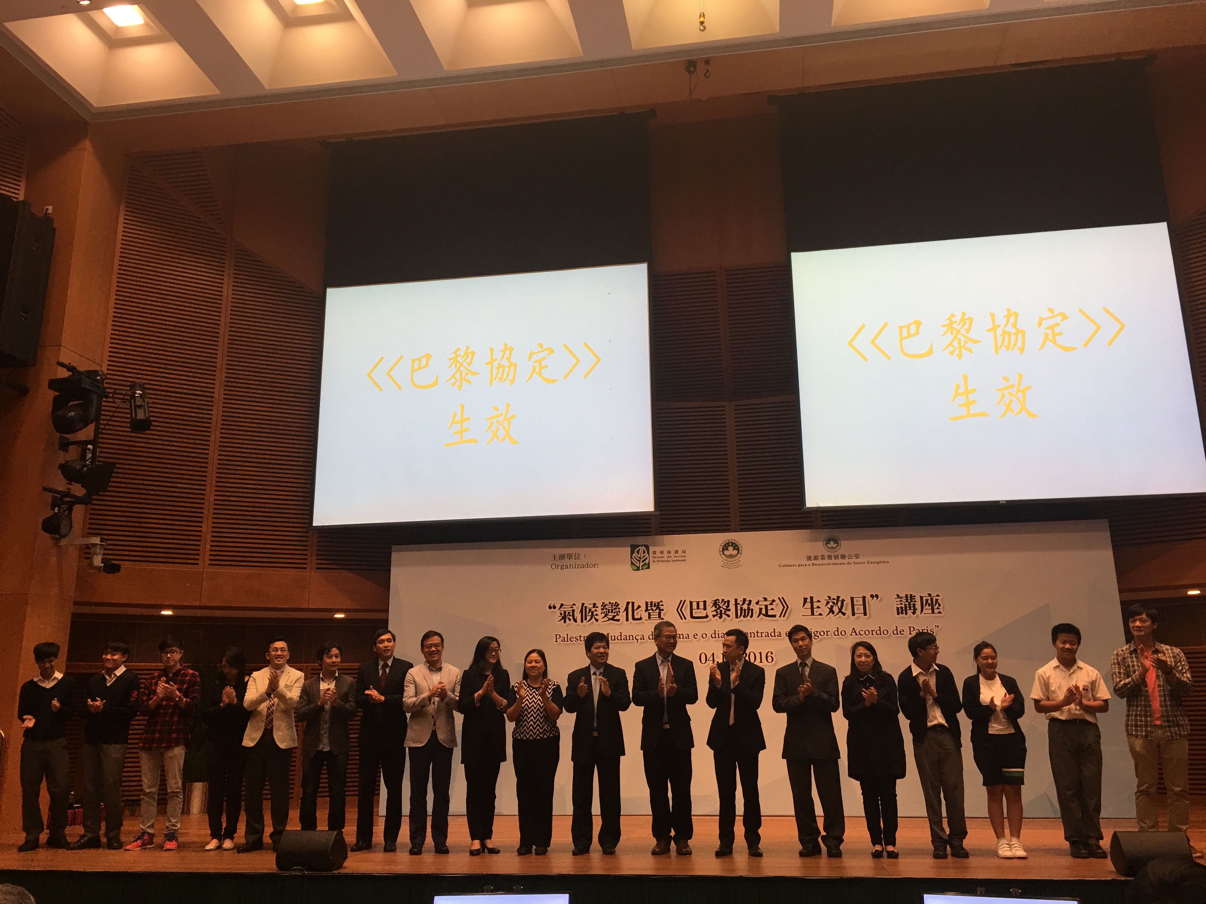 A fim de promover o Acordo de Paris e para intensificar os conhecimentos da população, a Direcção dos Serviços Meteorológicos e Geofísicos, em conjunto com a Direcção dos Serviços de Protecção Ambiental e o Gabinete para o Desenvolvimento do Sector Energético organizaram uma palestra com o tema “Mudança do clima e o dia de entrada em vigor do Acordo de Paris”, hoje, das 16:30 às 18:00 horas, na Sala de Conferência do Centro de Ciência de Macau. A palestra atraiu cerca de 200 participantes, os quais incluem Grupo de Trabalho Interdepartamental das Alterações Climáticas, sector energético, grupos de protecção ambiental e representantes dos hotéis verdes, bem como estudantes e docentes das escolas verdes, nomeadamente o Instituto Salesiano, a Escola Pui Ching e a Escola Kao Yip.