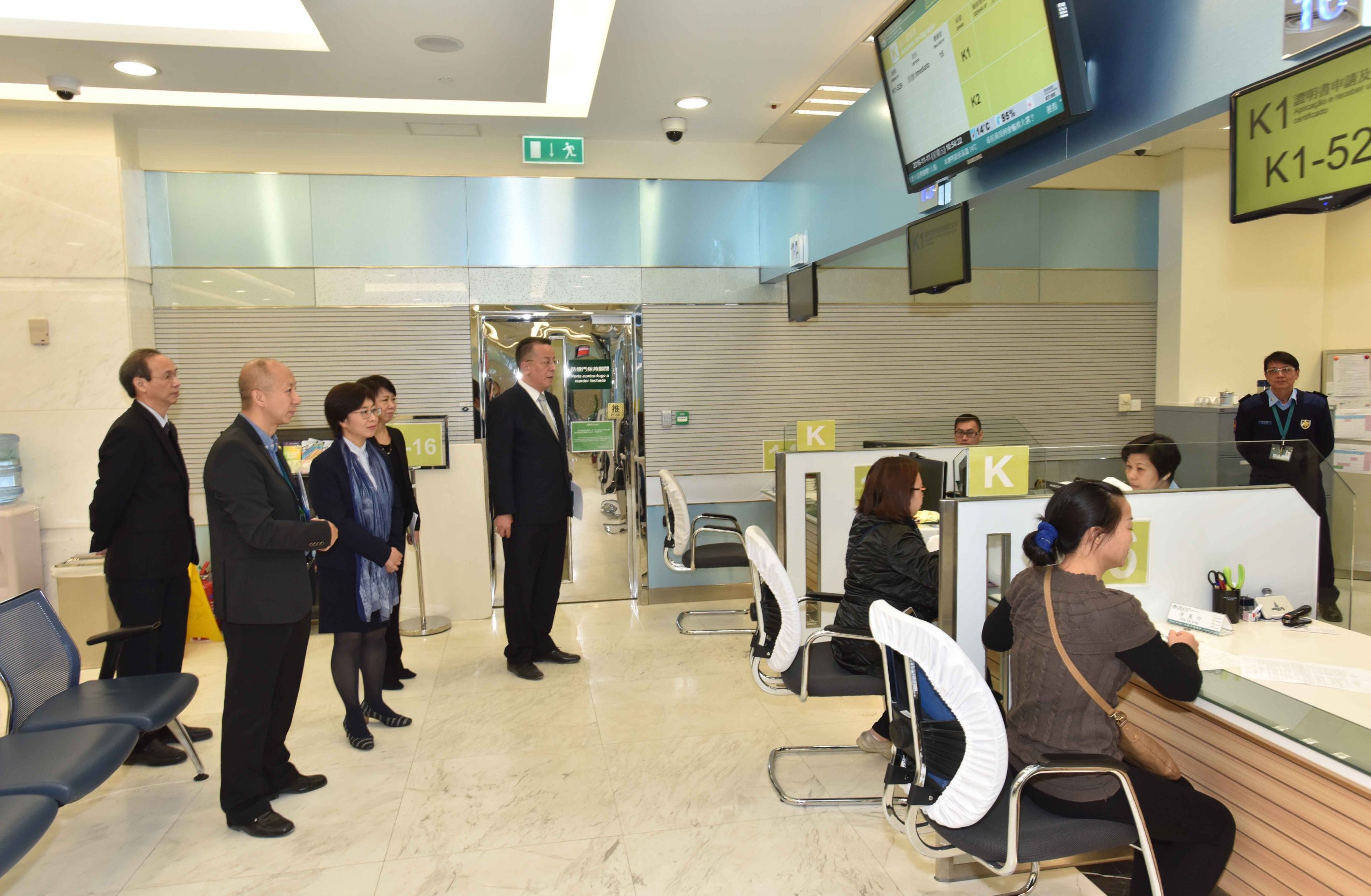 Acompanhada pelos dirigentes dos serviços, a Secretária Sónia Chan visitou respectivamente as conservatórias e o notário situados no prédio da Administração Pública, o salão de atendimento ao público e a zona dos quiosques da DSI, bem como as diversas zonas de serviço do Centro de Serviços da RAEM e a zona dos quiosques de 24 horas, a Secretária tomou atenção nas situações da promoção dos serviços digitais, a simplificação do procedimento administrativo e a cooperação interdepartamentais dos serviços visitados.