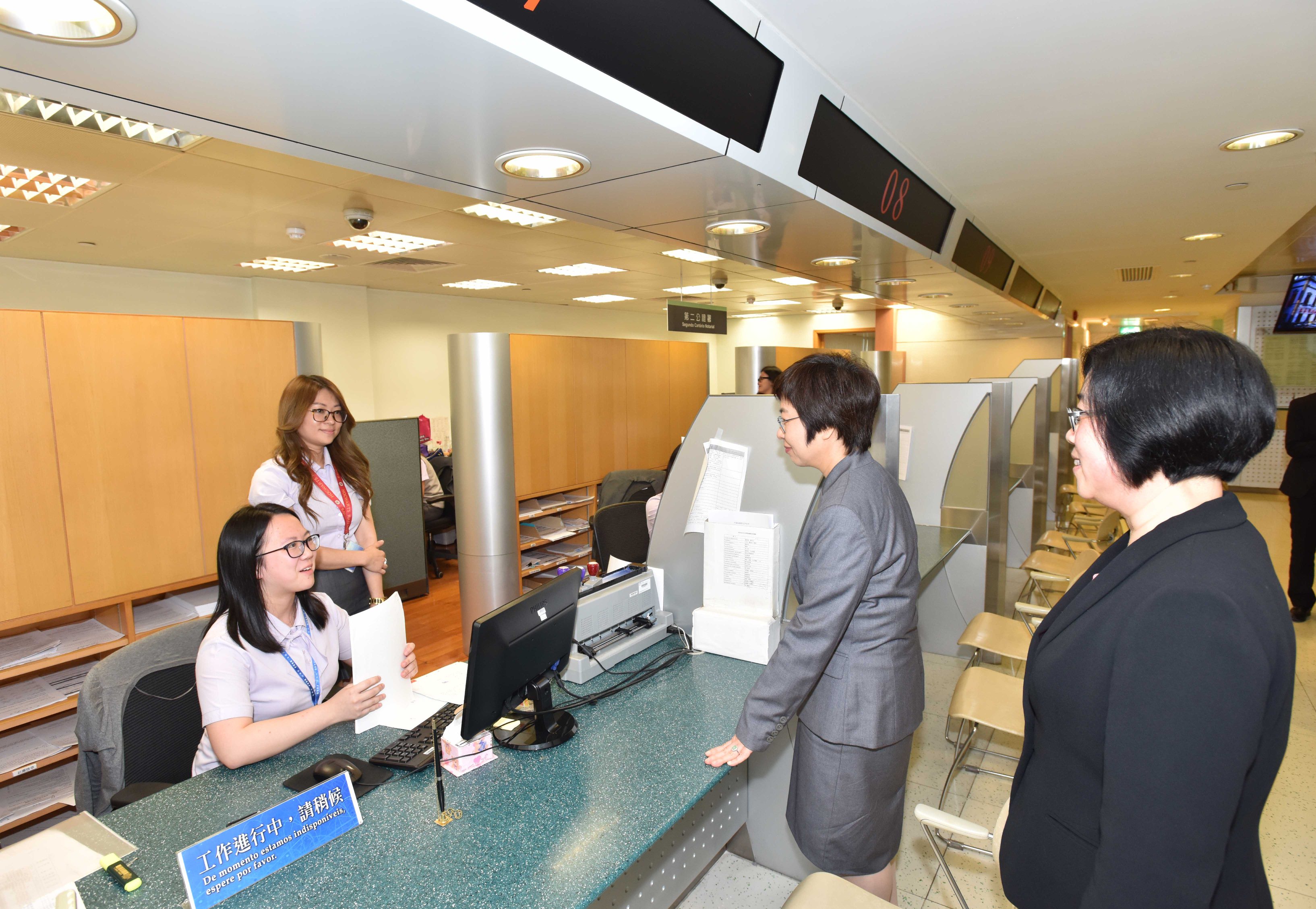 Durante as visitas, a Secretária conversou com muitos cidadãos, ouvindos as opiniões deles sobre o uso dos serviços públicos, tendo também intercâmbio com as chefias e trabalhadores da linha frente para conhecer tanto as situações quotidianas como as dificuldades e desafios de trabalho. A Secretária elogiou os trabalhos realizados, incentivando o pessoal a persistir no espírito de servir a população, a colaborar-se com as acções governativas da racionalização estrutural da administração, da promoção dos serviços digitais e da simplificação do procedimento administrativo, a fim de corresponder ao apelo do desenvolvimento social e da população.