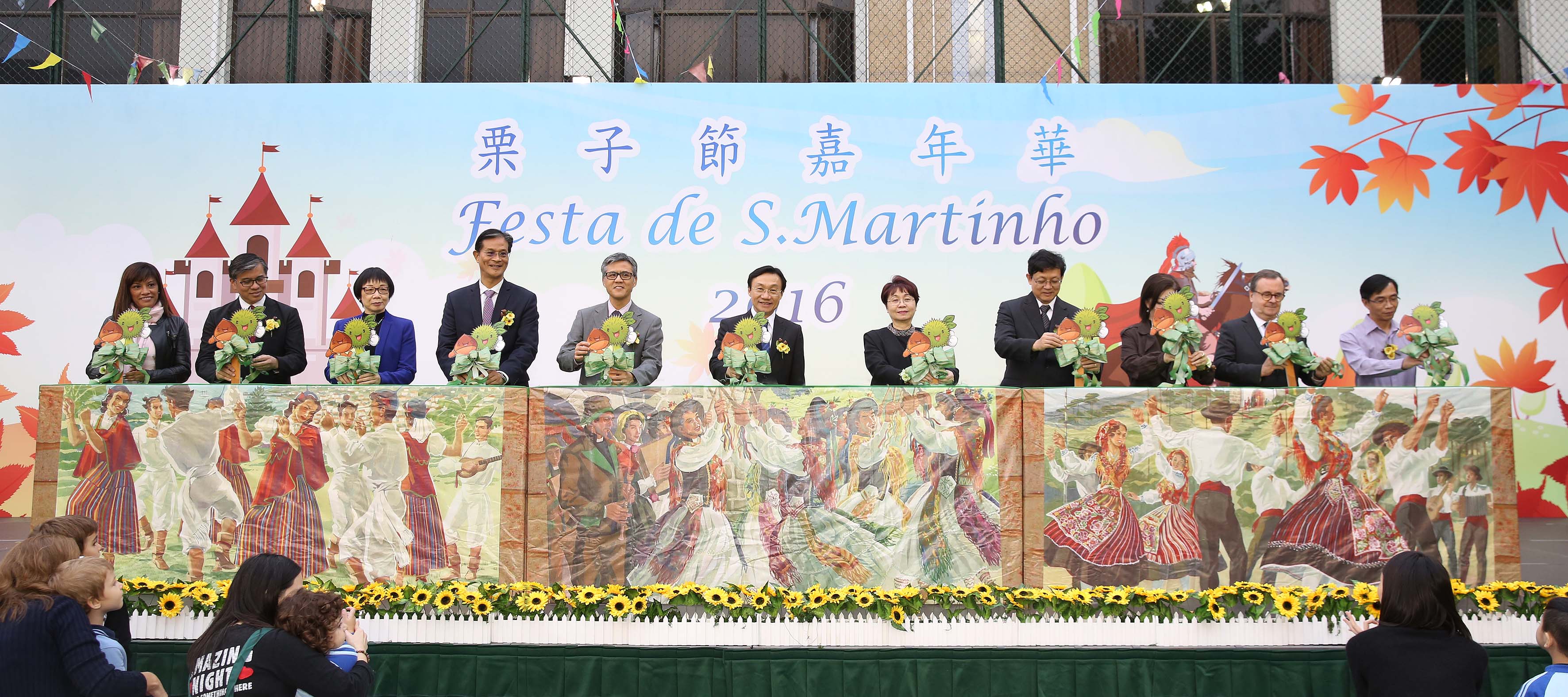 A cerimónia de abertura da “Festa de S. Martinho 2016” foi presidida por Alexis, Tam Chon Weng, Secretário para os Assuntos Sociais e Cultura, Ip Peng Kin, chefe do Gabinete do Secretário para os Assuntos Sociais e Cultura, Leong Lai, directora da DSEJ, Wai Cheng Iong, assessor do Gabinete do Secretário para os Assuntos Sociais e Cultura, Lou Pak Sang e Kuok Sio Lai, subdirectores da DSEJ, Leong Iao Cheng, director da Escola Secundária Luso-Chinesa Luís Gonzaga Gomes, Felizbina Gomes, directora da Escola Primária Luso-Chinesa da Flora, Manuel Machado, presidente da direcção da Escola Portuguesa de Macau, Lola do Rosário, directora do Jardim de Infância D. José da Costa Nunes, e ainda Chan Iao Hong, vice-presidente da Associação de Pais e Encarregados de Educação da Escola Luso-Chinesa da Flora. O evento contou com várias actividades, destacando-se as barraquinhas com decorações tradicionais tipicamente portuguesas, que não só disponibilizaram jogos para divertimento e comidas portuguesas e chinesas, como também proporcionaram vários espectáculos, tudo organizado e realizado, em conjunto, pelos professores, encarregados de educação e alunos, das várias unidades que colaboraram. O Secretário Alexis, Tam Chon Weng e outros convidados visitaram as barraquinhas típicas de jogos, tendo dialogado com os alunos, que conviveram num ambiente alegre.