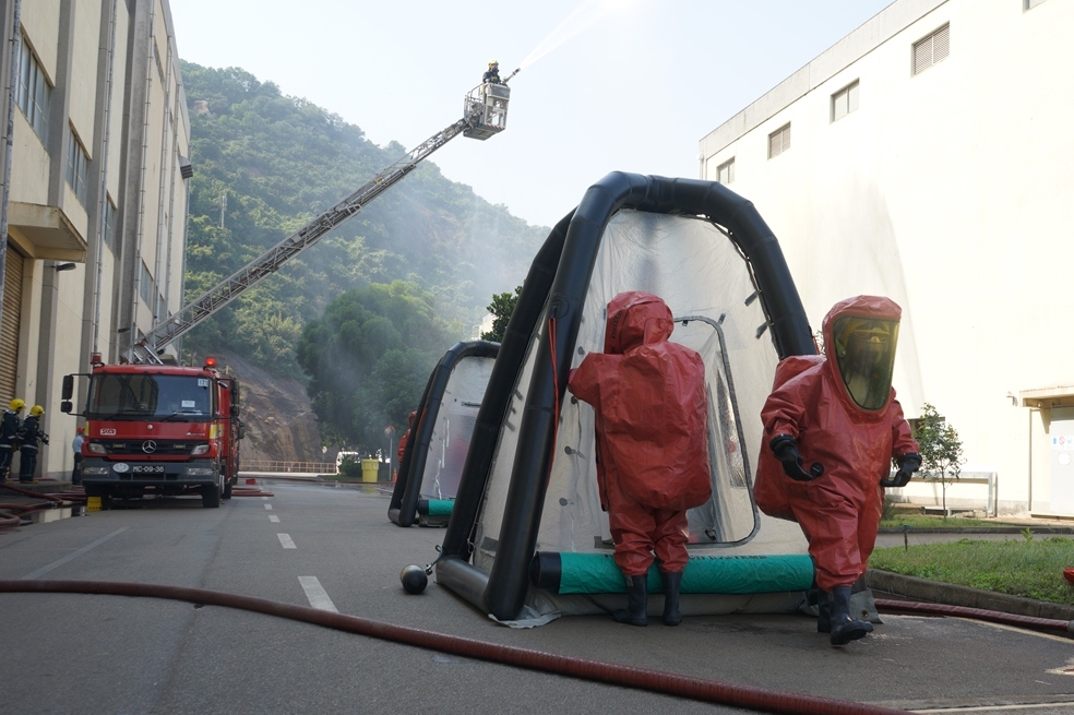 O exercício simulou a fuga no tubo da área de armazenagem de cloro na Central Térmica de Ká-Hó B. A Central Térmica de Ká-Hó accionou imediatamente as medidas de segurança, fechou todas as válvulas da tubagem, evacuou o respectivo pessoal para o local seguro de encontro, abordou rapidamente o incidente e as pessoas indispostas de acordo com o plano de contingência interno,e ligou para o CB. Durante o período, duas pessoas sentiram-se mal por terem inalado descuidadosamente o cloro perto da área de armazenagem de cloro. Após o alarme, esta Corporação enviou logo 7 veículos de emergência e 30 bombeiros ao local para executar a evacuação e lidar com o incidente conforme o plano definido. O simulacro durou cerca de 40 minutos.