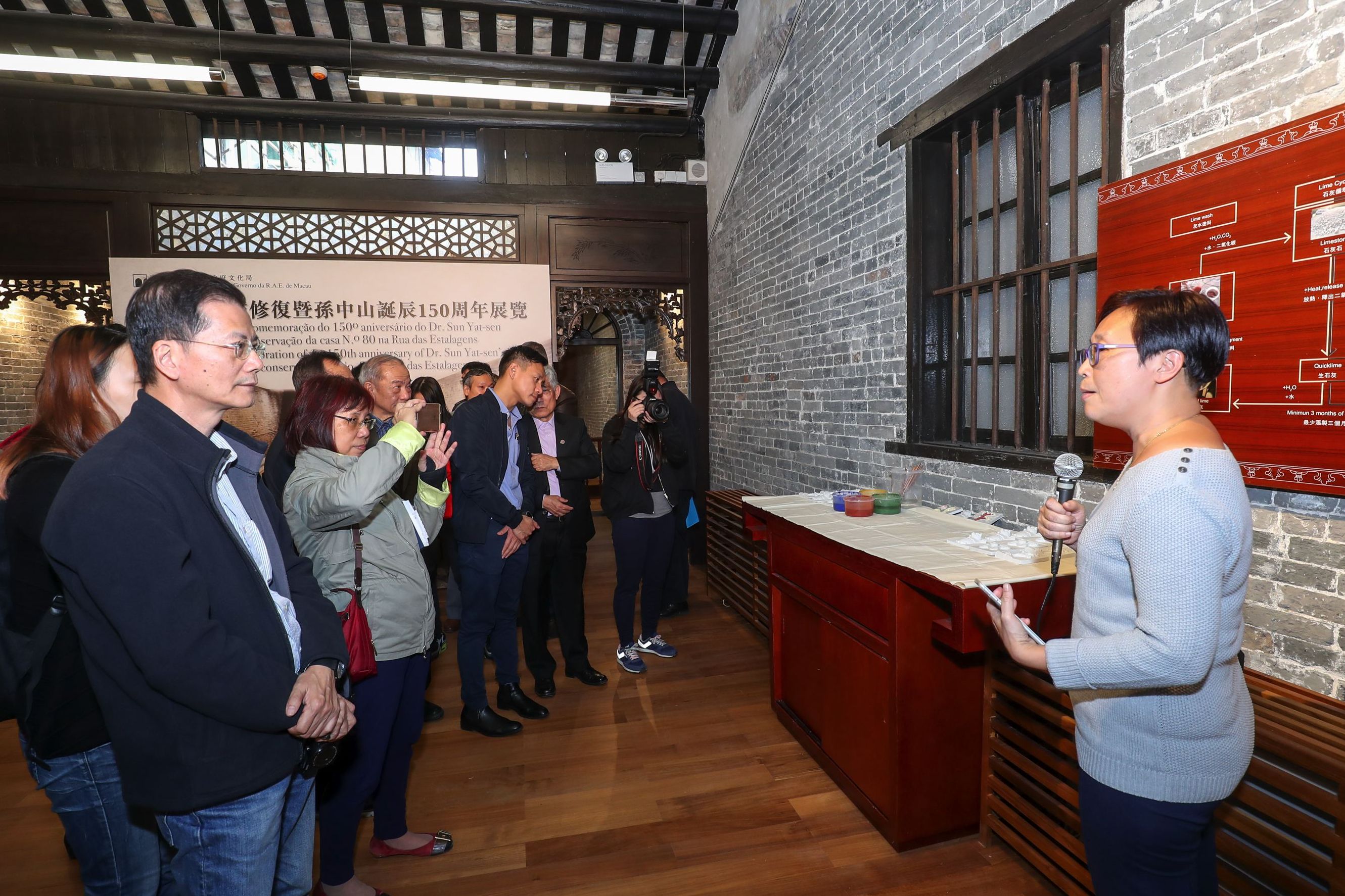 O Instituto Cultural (IC) realizou a cerimónia de inauguração da exposição “Exposições em comemoração do 150.o aniversário do Dr. Sun Yat-sen e sobre a conservação da casa N.o 80 na Rua das Estalagens” no dia 15 de Dezembro (Quinta-feira), pelas 15:30 horas, no Edifício do n.o 80 da Rua das Estalagens, a qual foi oficiada pelo Presidente do Instituto Cultural, Ung Vai Meng; o Curador do Museu de Dr. Sun Yat-sen da Vila Tsuiheng na cidade Zhongshan, Huang Jianmin; o Presidente da Associação de História de Macau, Chan Su Weng; a experiente educadora de Macau, Lau Sin Peng e Director da Associação de Beneficência e Assistência Mútua dos Moradores das 6 Ruas Chou Toi, Lo Teng Kam. Estiveram presentes os membros de Conselho do Património Cultural, especialistas e residentes, entre outros.