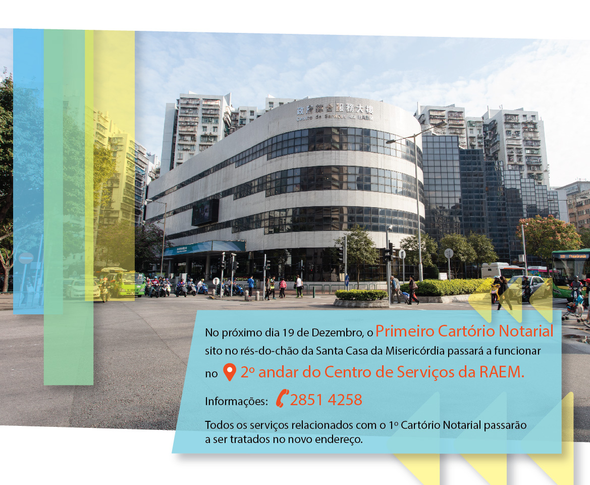 O Primeiro Cartório Notarial da Região Administrativa Especial de Macau sito no Largo do Senado, n.º 16, Edifício da Santa Casa da Misericórdia, r/c, irá proceder à mudança de instalações no dia 19 de Dezembro de 2016 (Segunda-feira) para a Rua Nova da Areia Preta, n.º 52, Centro de Serviços da RAEM, 2º andar, onde todos os serviços relacionados com o 1º Cartório Notarial passarão a ser tratados.