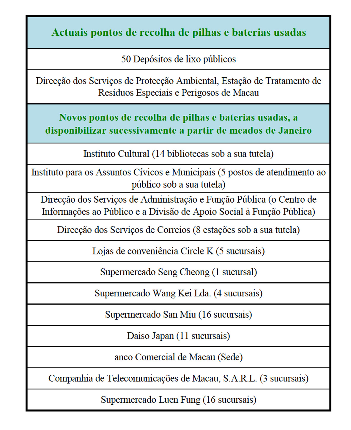 Além disso, a disponibilização gradual de mais de 80 novos pontos de recolha de pilhas e baterias usadas em todas as zonas de Macau, será iniciada pela DSPA em meados de Janeiro do próximo ano, em colaboração com outros serviços públicos, estabelecimentos comerciais e instituições, estando estes pontos situados: nas 14 bibliotecas sob tutela do Instituto Cultural, nas 8 estações sob tutela da Direcção dos Serviços de Correios, nos 5 postos de atendimento ao público do Instituto para os Assuntos Cívicos e Municipais, no Centro de Informações ao Público e na Divisão de Apoio Social à Função Pública dependentes da Direcção dos Serviços de Administração e Função Pública; e em outros 57 locais participantes nessa recolha, nomeadamente os supermercados, lojas de conveniência, companhia de telecomunicações e bancos, entre outros (ver a lista abaixo). Os endereços e o horário dos pontos de recolha, assim como as «Instruções para a recolha de pilhas e baterias usadas» podem ser consultados na página electrónica desta Direcção de Serviços www.dspa.gov.mo/batteryrecycling.aspx , ou através da Linha Ambiental 2876 2626.