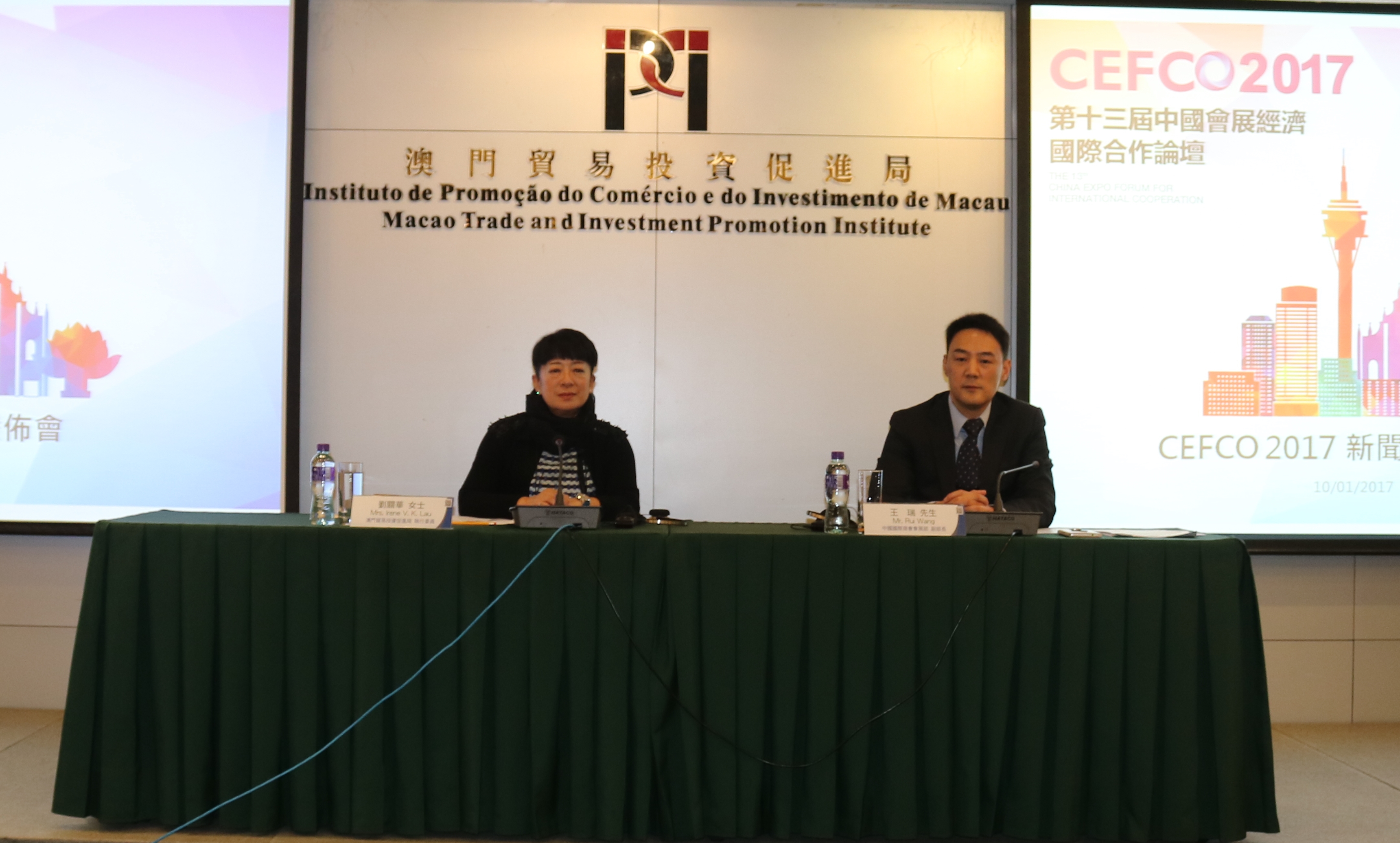 O CEFCO 2017 é organizado conjuntamente pelo Conselho Chinês para a Promoção do Comércio Internacional (CCPIT, na sigla inglesa), pela Associação Global da Indústria de Exposições (UFI, na sigla inglesa), pela Associação Internacional de Exposições e Eventos (IAEE, na sigla inglesa) e pela Sociedade de Organizadores Independentes de Eventos (SISO, na sigla inglesa), com a colaboração da Câmara de Comércio Internacional da China (CCOIC, na sigla inglesa) e do Instituto de Promoção do Comércio e do Investimento de Macau (IPIM). A fim de que os media tenham um melhor conhecimento sobre o Fórum, foi convocada, em Macau, mais uma conferência de imprensa hoje (10 de Janeiro de 2017), depois da realização da outra em Pequim em 12 de Dezembro de 2016. A Vogal Executiva do IPIM, Dra. Irene Va Kuan Lau e o Subdirector do Departamento de Convenções e Exposições da CCOIC, Dr. Wang Rui fizeram uma apresentação dos últimos preparativos do CEFCO 2017.