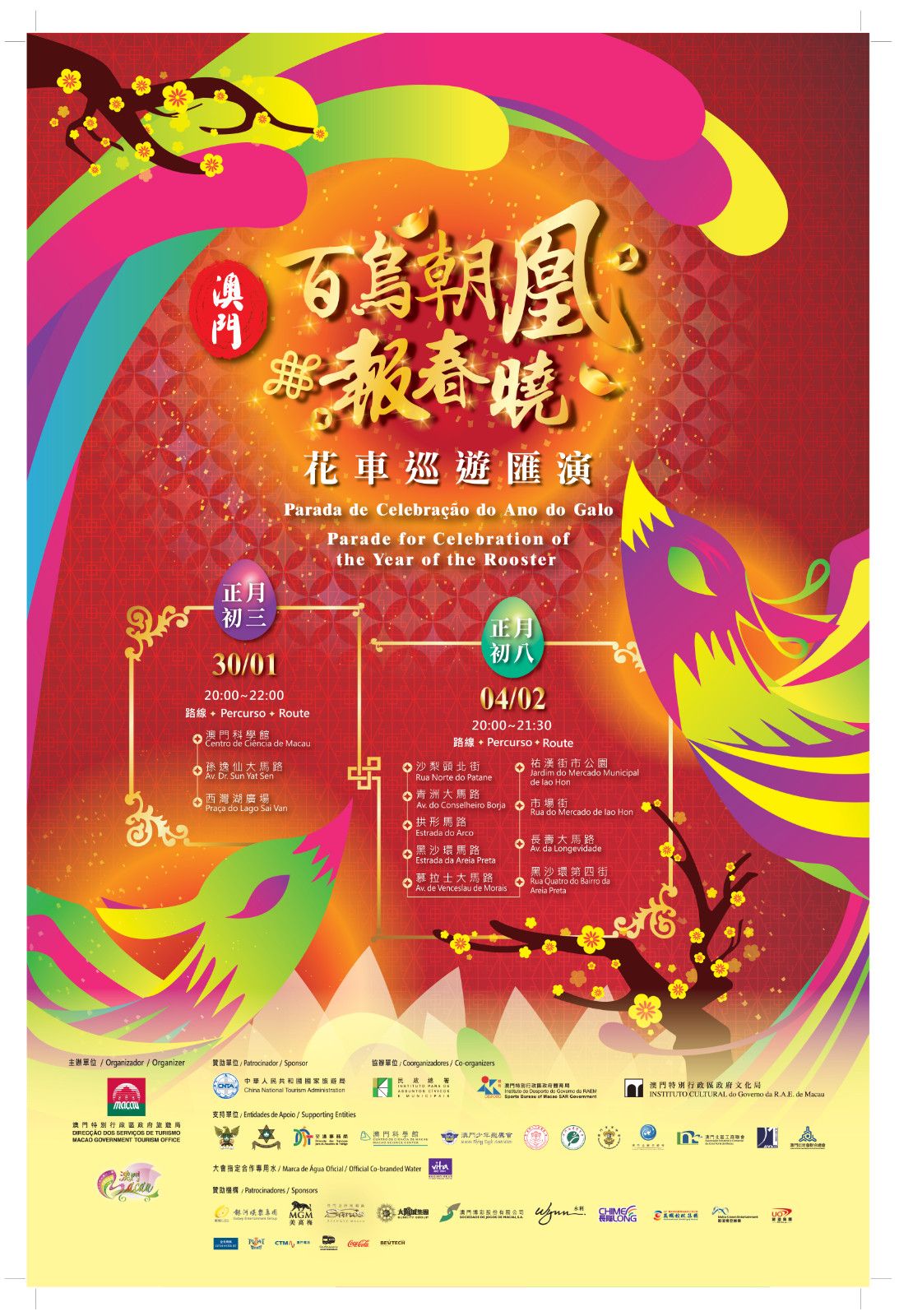 A Direcção dos Serviços de Turismo (DST) apresenta no terceiro e no oitavo dia do Ano Novo Lunar (30 de Janeiro e 4 de Fevereiro) uma grande comemoração do Ano Novo Chinês, a Parada de Celebração do Ano do Galo, para celebrar o Festival de Primavera com os residentes e visitantes de Macau. O rico programa da parada conta com desfile de carros alegóricos, espectáculos culturais de grande envergadura, fogo de artifício, exibição de carros alegóricos, concurso de fotografia, entre outros. A DST pretende continuar a elevar a escala e o impacto do evento, a fim de diversificar o mercado de visitantes e aumentar a participação dos residentes.