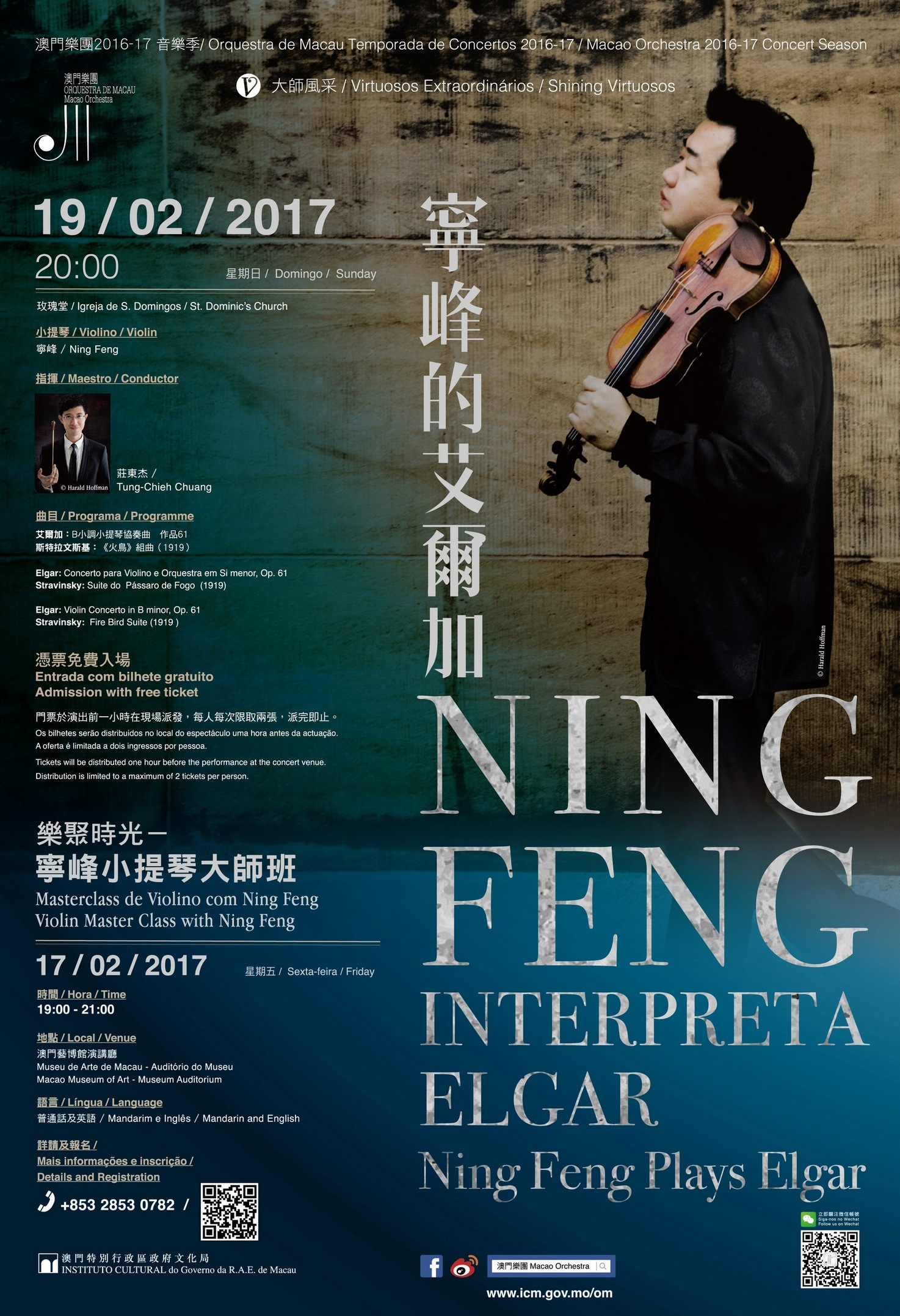 A Orquestra de Macau (OM) do Instituto Cultural apresenta o concerto “Ning Feng Interpreta Elgar” no dia 19 de Fevereiro (Domingo), pelas 20:00 horas, na Igreja de S. Domingos. O concerto será dirigido pelo jovem maestro convidado de Taiwan Tung-Chieh Chuang e conta com um solo pelo internacionalmente renomado violinista chinês Ning Feng, um músico muito respeitado e acarinhado pelo público de Macau. O violinista irá orientar uma master classde Violino, seja bem-vinda a inscrição dos interessados.
