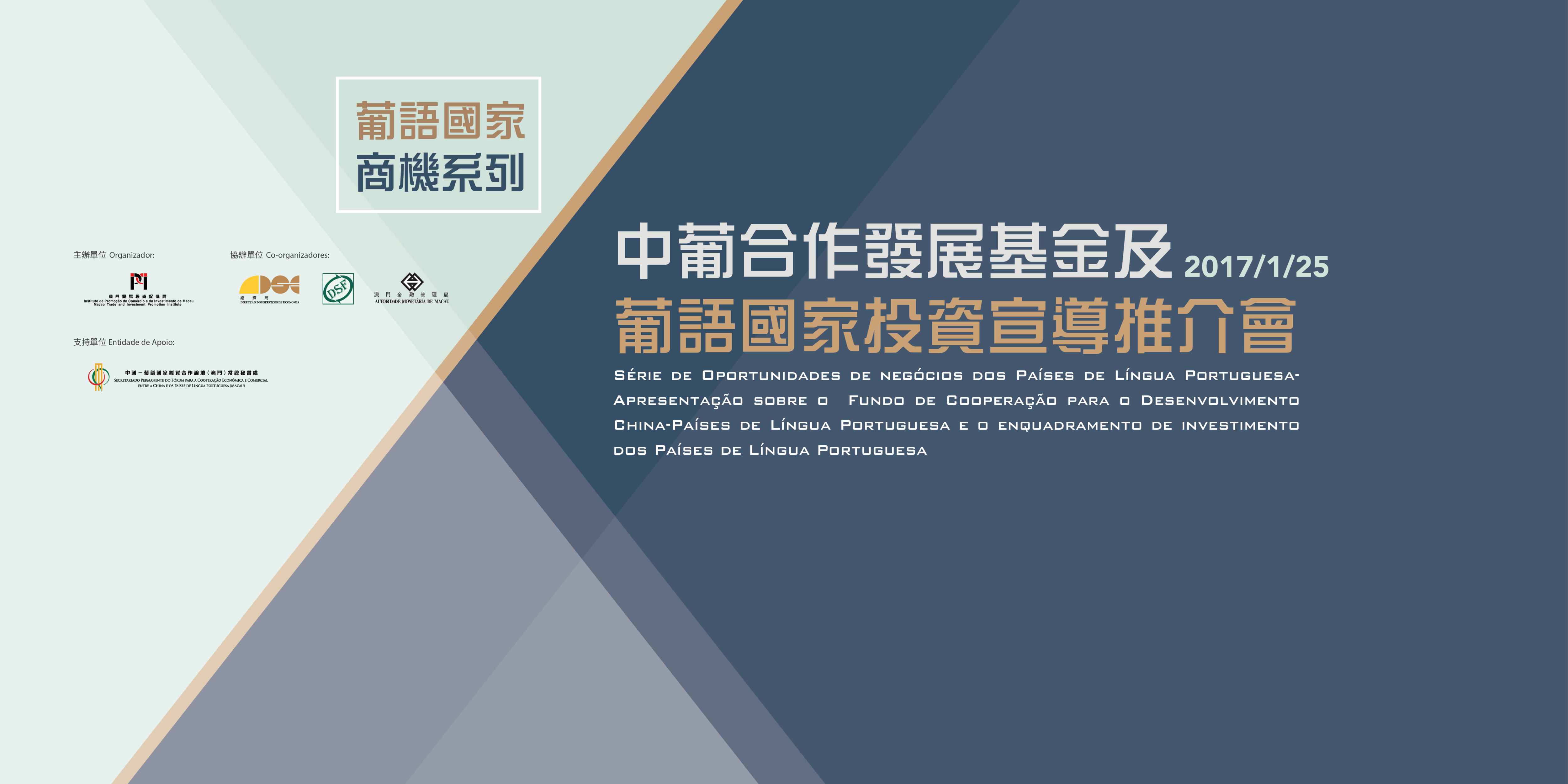 A fim de promover o desenvolvimento da cooperação empresarial no âmbito de investimento, entre a China Continental, Macau e os Países de Língua Portuguesa, sob a organização do Instituto de Promoção do Comércio e do Investimento de Macau (IPIM) , a coorganização da Direcção dos Serviços de Economia, Direcção dos Serviços de Finanças e Autoridade Monetária de Macau e apoio assegurado pelo Secretariado Permanente do Fórum para a Cooperação Económica e Comercial entre a China e os Países de Língua Portuguesa, realizar-se-á no dia 25 de Janeiro de 2017, das 10:00 às 12:00, no 5º andar, Sala Lótus do Edificio World Trade Centre, a “Série de Oportunidades de negócios dos Países de Língua Portuguesa- Apresentação sobre o Fundo de Cooperação para o Desenvolvimento China-Países de Língua Portuguesa e o enquadramento de investimento dos Países de Língua Portuguesa”.