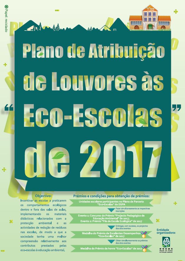 Estão abertas as inscrições do Plano de Atribuição de Louvores às “Eco-Escolas” de 2017 (designado por “Plano”) organizado pela DSPA. O objectivo do Plano é o de incentivar as escolas a praticarem os comportamentos ambientais, quer dentro da sala de aulas quer fora da sala de aulas, e impulsionar a utilização de materiais pedagógicos e a realização de actividades escolares destinadas à redução de resíduos, para que a sociedade compreenda melhor os contributos dedicados pelas Eco-escolas no âmbito da educação ambiental. Este Plano cria o Prémio de honra “Eco-Escolas” e o Prémio de Excelentes Desempenhos “Eco-Escolas”, e as eco-escolas que incentivem concomitantemente os seus professores e estudantes a candidatarem-se ao Concurso do Prémio “Projecto Pedagógico de Educação Ambiental”, bem como ao Prémio “Fãs de Escola Ecológica” de 2017 terão a oportunidade de lhes ser atribuídos os prémios acima referidos.