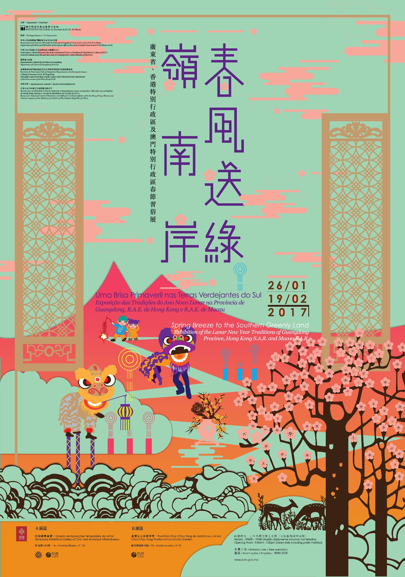 “Uma Brisa Primaveril nas Terras Verdejantes do Sul – Exposição das Tradições do Ano Novo Lunar na Província de Guangdong, R.A.E. de Hong Kong e R.A.E. de Macau” estará patente entre 26 de Janeiro e 19 de Fevereiro, na Galeria de Exposições Temporárias do IACM (Avenida de Almeida Ribeiro, n.º 163) e no Pavilhão Chun Chou Tong do Jardim Lou Lim Ioc (Estrada Adolfo Loureiro, n.º 10), com entrada livre. A exposição está aberta diariamente das 09:00 às 19:00 horas, incluindo nos dias feriados. Para mais informações sobre a exposição e palestra, é favor contactar o IC através do telefone n.º 8988 4000, durante o horário do expediente.