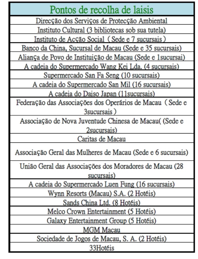 Além disso, o Plano da Recolha de Pilhas e Baterias Usadas de Macau conta já com mais de 300 pontos de recolha espalhados pelas diversas zonas de Macau, desde o seu lançamento pela DSPA no final do ano passado e até ao momento. Este plano motivou ainda a cooperação de mais de 60 escolas e instituições de ensino superior na disponibilização de pontos de recolha. Por outro lado, a DSPA está activamente a criar novos pontos de recolha nos edifícios habitacionais, industriais e comerciais e, presentemente, estão disponíveis pontos de recolha em mais de 50 edifícios. No futuro a DSPA continuará a alargar a rede de recolha para facilitar aos cidadãos a prática de actos amigos do ambiente.