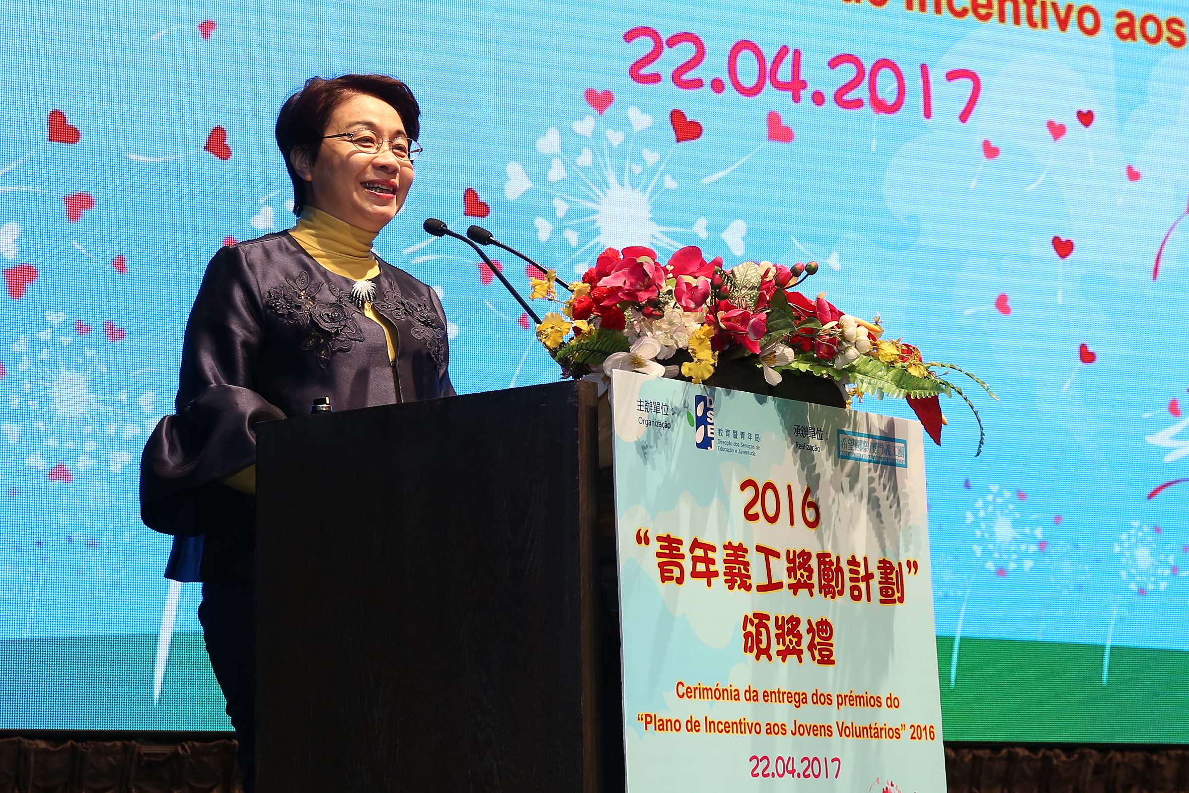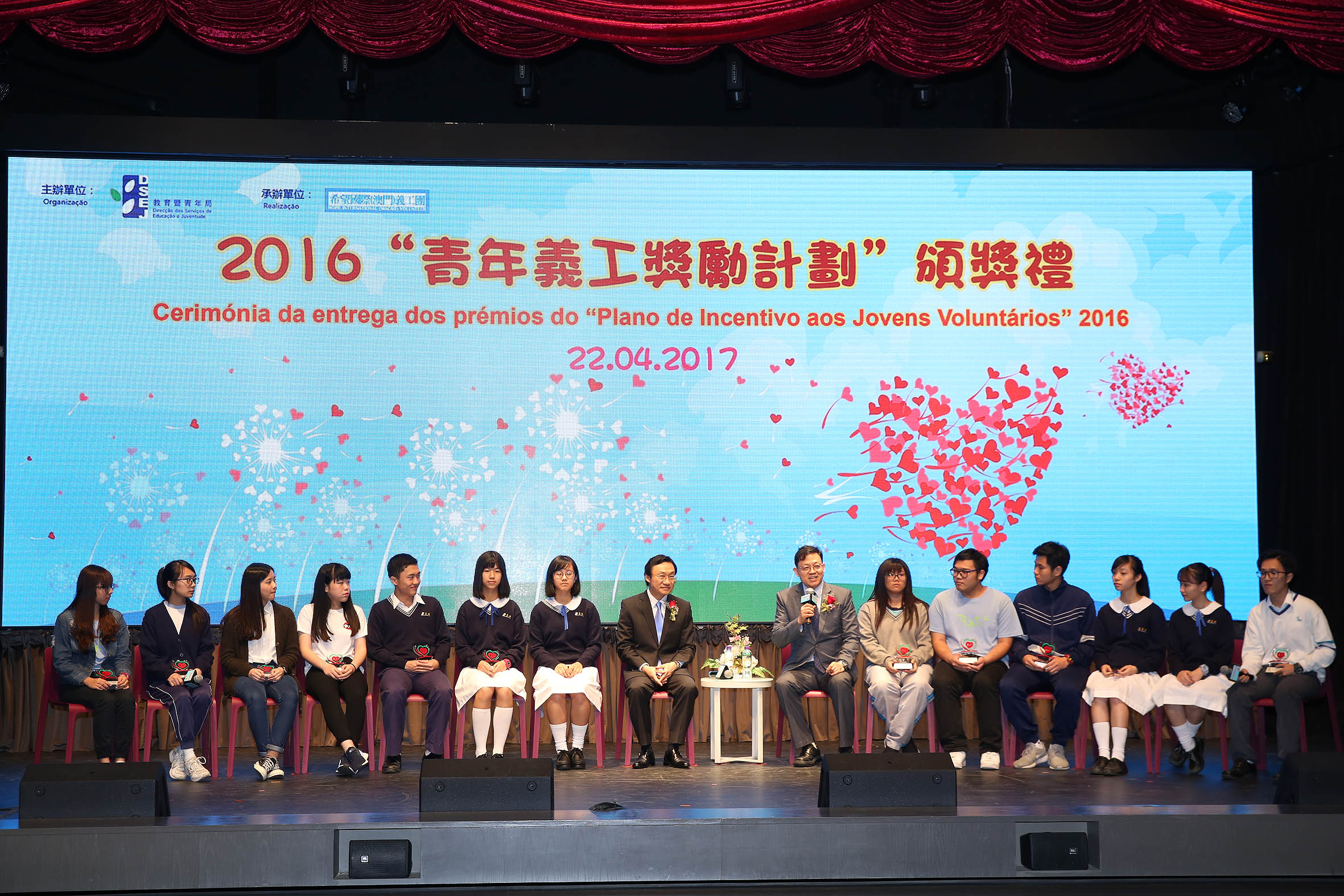 A cerimónia de entrega dos prémios do “Plano de Incentivo aos Jovens Voluntários” 2016 organizado pela Direcção dos Serviços de Educação e Juventude (DSEJ) e realizado pelo Hope International Volunteer Group Macao, teve lugar no dia 22 de Abril de 2017 (Sábado), no auditório da Escola São Paulo. Esta cerimónia, que conta já com duas edições, teve como objectivo elogiar e reconhecer as contribuições dos jovens voluntários em prol da sociedade, dando continuidade e divulgando o espírito de ajuda ao próximo, bem como a si próprio, atraindo os diversos sectores sociais e os jovens para aderirem aos trabalhos voluntários. No intuito de estimular os jovens a participarem, continuamente, nos trabalhos voluntários, foram atribuídos, nesta edição e pela primeira vez, os “Prémios de Platina dos Jovens Voluntários” para aqueles que acumularam dois “Prémios de Ouro de Jovens Voluntários”. O Secretário para os Assuntos Sociais e Cultura, Alexis, Tam Chon Weng, atribuiu os Prémios de Platina a 13 jovens voluntários distinguidos e teve ainda oportunidade de interagir com eles, em palco, numa partilha de experiências e intercâmbio de ideias. Este ano, a entidade organizadora continuou a montar várias tendinhas para divulgar e promover os trabalhos voluntários dos jovens.