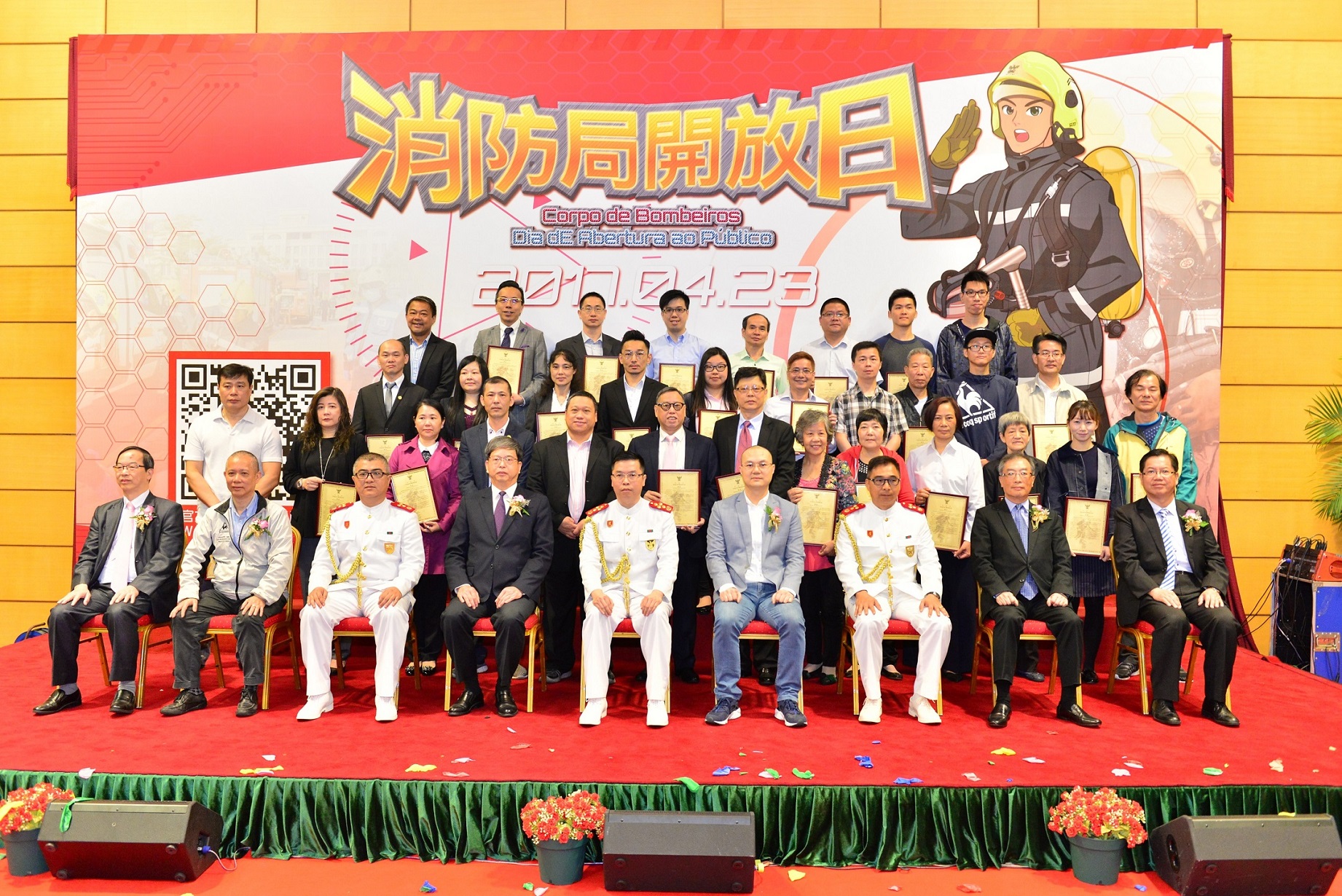 A cerimónia de inauguração do Dia de Abertura ao Público do Corpo de Bombeiros foi presidida pelo Comandante do CB, chefe-mor Leong Iok Sam. Os representantes de várias associações e organizações de Macau também marcaram presença no evento (sem nenhuma ordem em particular): União Geral das Associações dos Moradores de Macau, Aliança de Povo de Instituição de Macau, Associação de Administração de Propriedades de Macau e Associação de Profissionais do Sector da Administração de Propriedades de Macau.