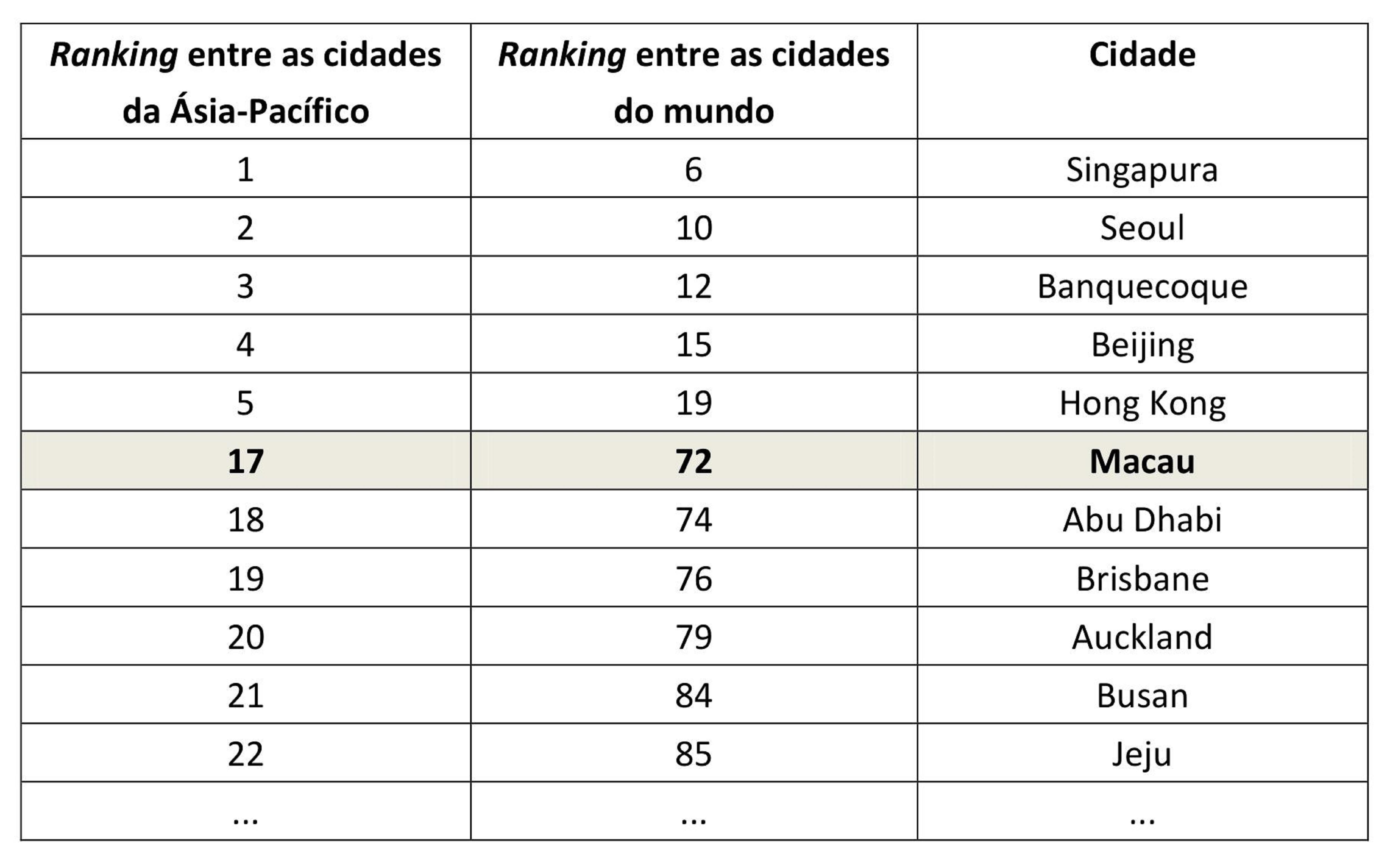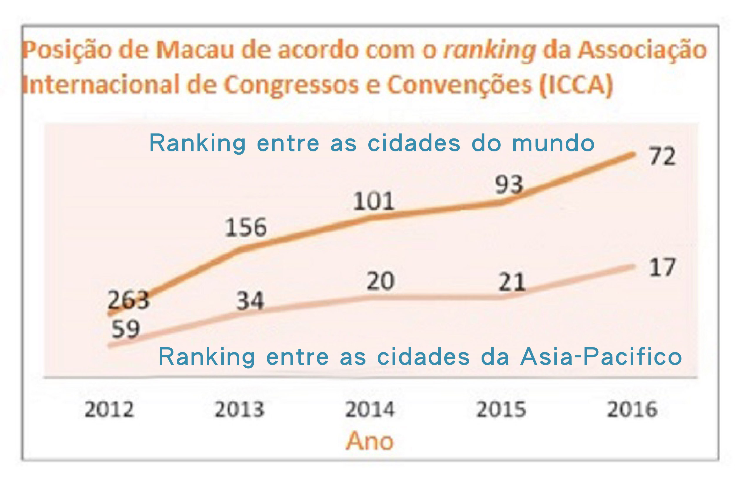 A Associação Internacional de Congressos e Convenções (ICCA, na sigla em inglês) publicou recentemente o seu relatório anual sobre a situação o mercado internacional de convenções de 2016 (2016 International Meetings Market Annual Report). De acordo com o referido relatório, Macau registou subidas em diversos indicadores, com resultados encorajadores, designadamente: no ranking entre as cidades do mundo, Macau subiu da 93.ª posição, registada em 2015, para 72.º lugar. No tocante ao ranking entre as cidades da Ásia-Pacífico, a RAEM melhorou também a sua posição, ocupando agora o 17.º lugar. Além disso, a ICCA reconheceu 37 convenções realizadas em Macau, sendo esse um número recorde.