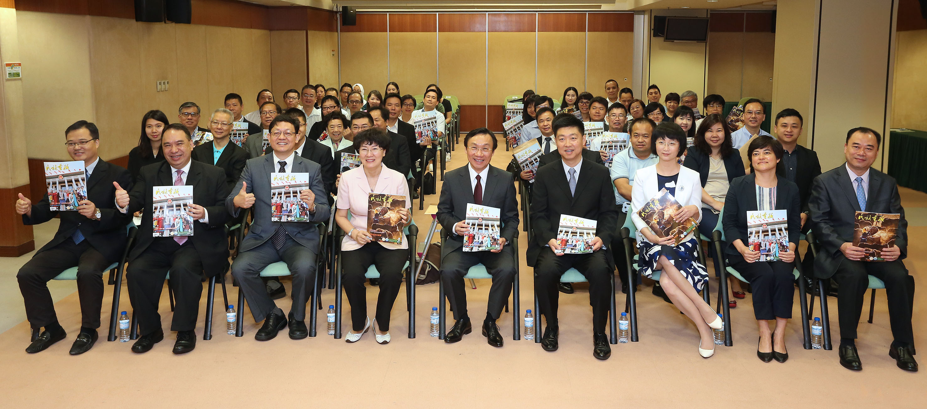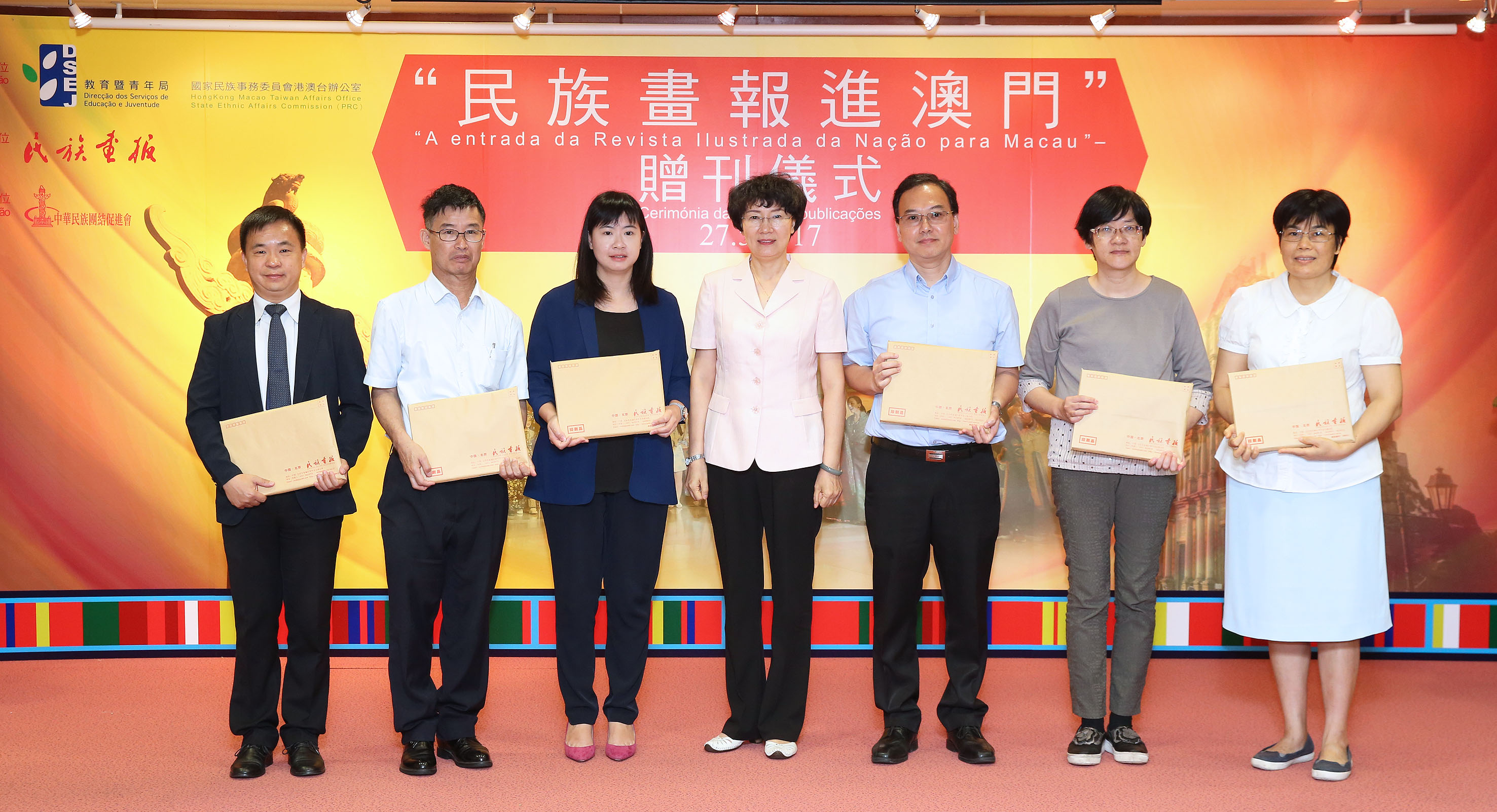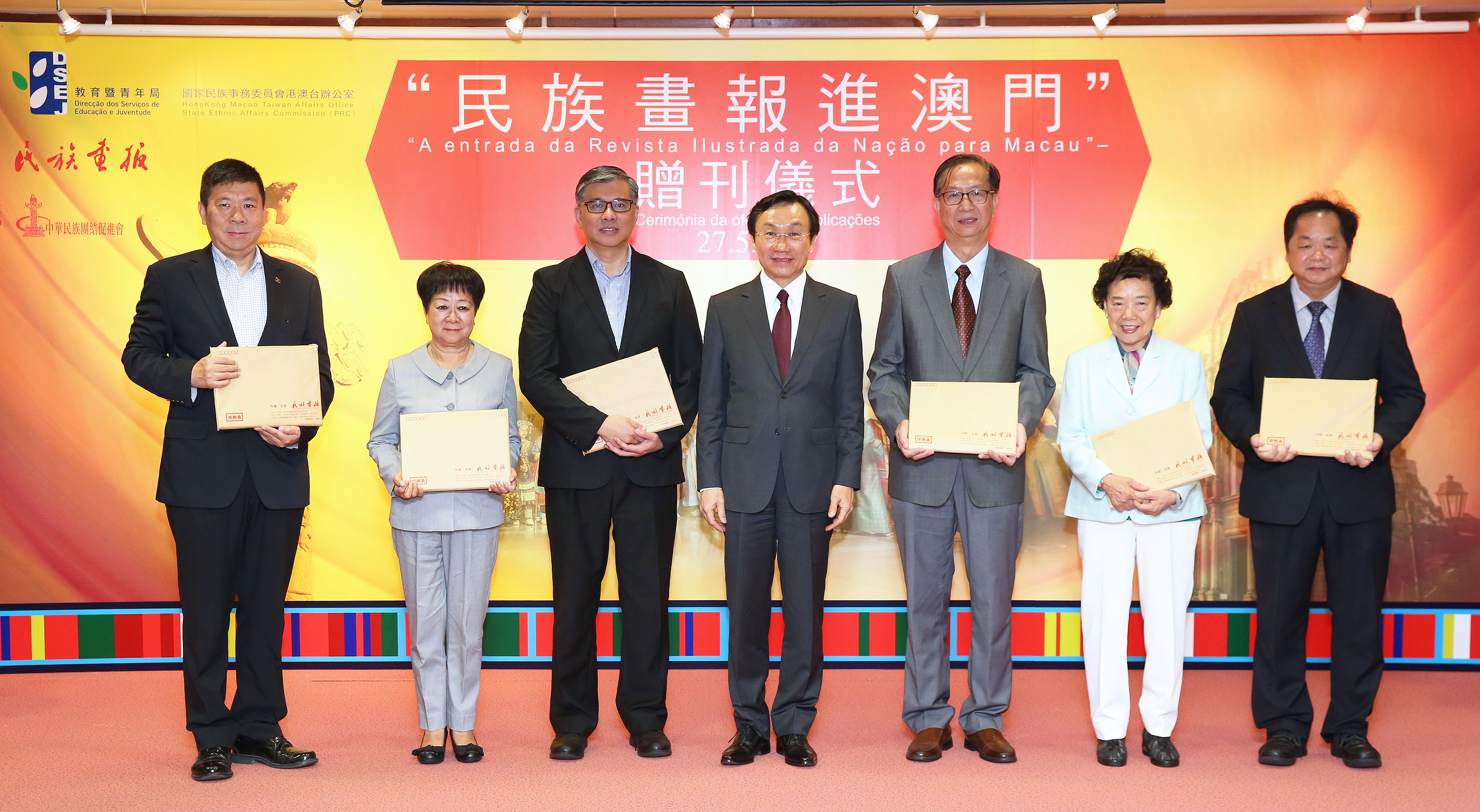 Organizada em conjunto pela Direcção dos Serviços de Educação e Juventude (DSEJ) e pelo Gabinete para os Assuntos de Hong Kong, Macau e Taiwan da Comissão para os Assuntos das Nacionalidades do Estado, realizada pela Associação Promotora de União da Nação da China e apoiada pela Editora da Revista Ilustrada da Nação, a Cerimónia de Oferta de Publicações “A entrada da Revista Ilustrada da Nação para Macau” decorreu no dia 27 de Maio, na parte da manhã, no Salão de Conferências Confúcio, no 1.o andar do edifício-sede da DSEJ. O Secretário para os Assuntos Sociais e Cultura, Alexis Tam, a Directora dos Serviços de Cultura e Propaganda da Comissão para os Assuntos das Nacionalidades do Estado, Wu Cuiying, o subchefe do Departamento de Coordenação do Gabinete de Ligação do Governo Central na RAEM, Sheng Gang, o subdirector da DSEJ, Lou Pak Sang, a vice-redactora-chefe da Editora da Revista Ilustrada da Nação, Yu Hui e o presidente da Associação Promotora de União da Nação da China, Vong Veng Hin presidiram à cerimónia de oferta da “Revista Ilustrada da Nação” aos representantes das escolas de Macau.