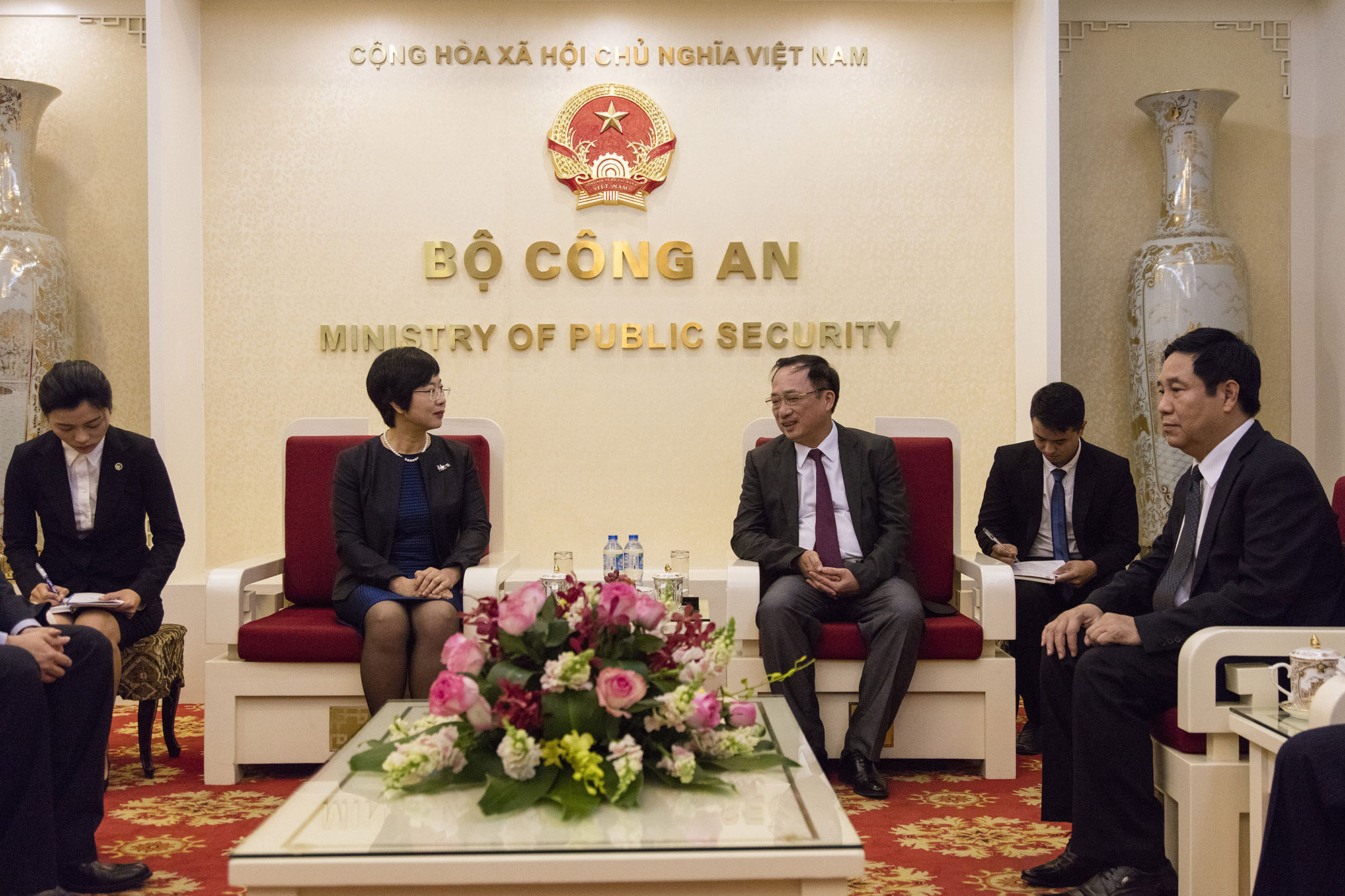 Durante a estadia no Vietname, a delegação teve encontros sucessivos com o Exmo. Sr. Dr. Nguyen Van Thanh, Vice-Ministro do Ministério de Segurança Pública do Vietname e o Exmo. Sr. Dr. Tran Cong Phan, Procurador-Adjunto da Procuradoria-Geral Popular do Vietname. No encontro com o Exmo. Sr. Dr. Nguyen Van Thanh, Vice-Ministro do Ministério de Segurança Pública do Vietname, a Exma. Sra. Dra. Sónia Chan apontou que, nos últimos anos, o intercâmbio e a cooperação entre a RAEM e o Vietname tem-se verificado em diversos domínios de forma mais estreita. Pelo que se justifica e reveste de um óbvio e real interesse a promoção da cooperação judiciária em matéria penal. A Exma. Sra. Secretária referiu ainda que o Governo Popular da China presta a maior atenção e apoia a visita da RAEM ao Vietname, tendo dado autorização à RAEM, antes da partida da delegação, para dar início às negociações no âmbito da cooperação judiciária em matéria penal sobre a entrega de infractores em fuga, a transferência de pessoas condenadas e a assistência judiciária recíproca em matéria penal. Espera-se que, mediante esta visita, as Partes possam chegar a um consenso sobre a promoção da cooperação nas aludidas áreas.