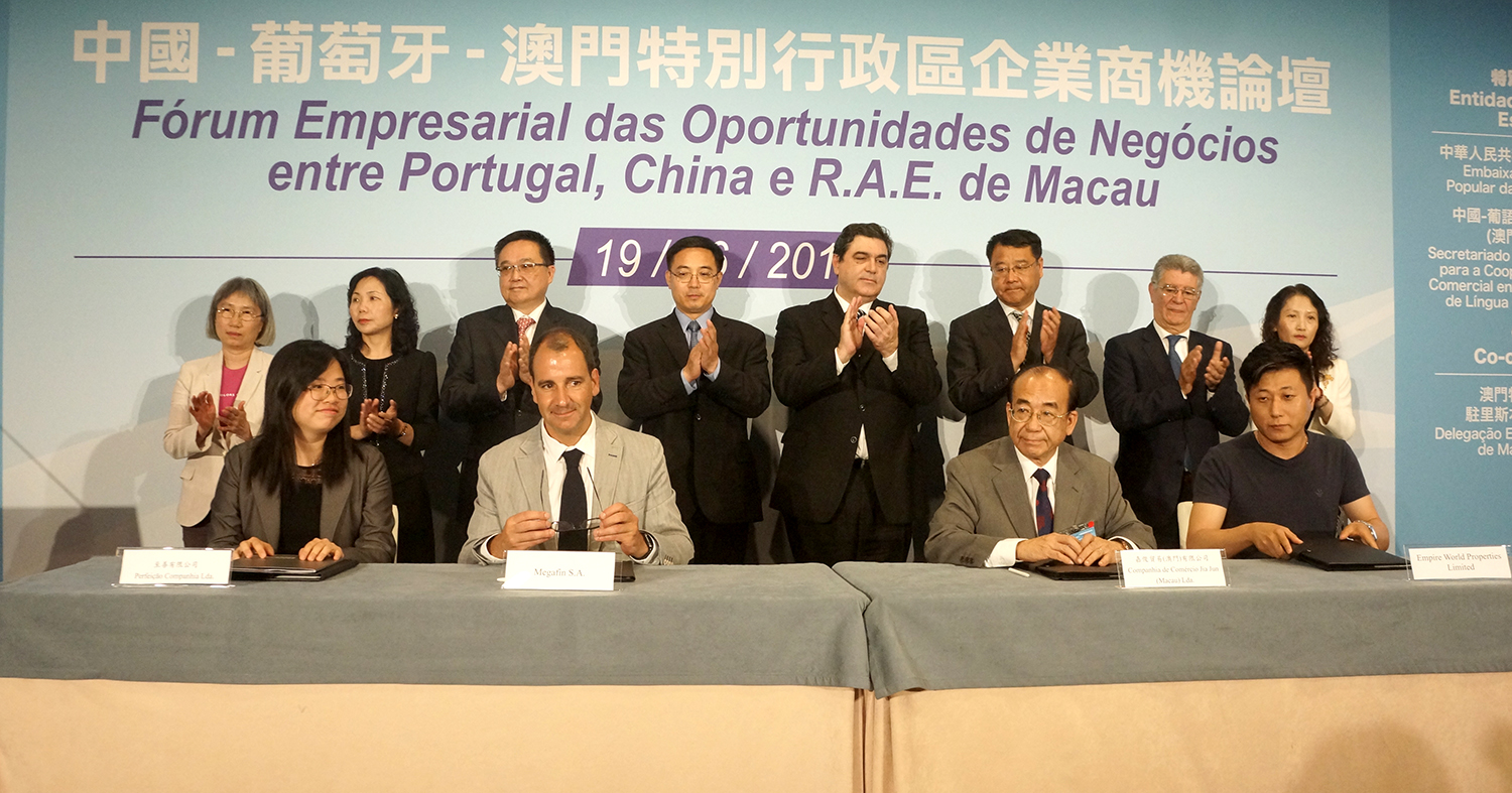 Após o bem-sucedido Encontro de Empresários para a Cooperação Económica e Comercial entre a China e os Países de Língua Portuguesa - Praia, a delegação dos empresários de Macau, organizada pelo Instituto de Promoção do Comércio e do Investimento de Macau (IPIM), deslocou-se a Portugal para participar no Fórum Empresarial das Oportunidades de Negócio entre Portugal, China e RAEM, um evento organizado conjuntamente pelo Conselho para a Promoção do Comércio Internacional da China (CCPIT), a Agência para o Investimento e Comércio Externo de Portugal (AICEP) e o IPIM. O referido Fórum atraiu a participação de acima de 220 empresários provenientes do Interior da China, de Portugal e de Macau, que realizaram em conjunto a discussão temática em redor da Cooperação na Capacidade Produtiva entre a China e os Países de Língua Portuguesa. Além disso, foi efectuada, no decorrer do Fórum, a assinatura de dois projectos entre empresários de Macau e de Portugal.