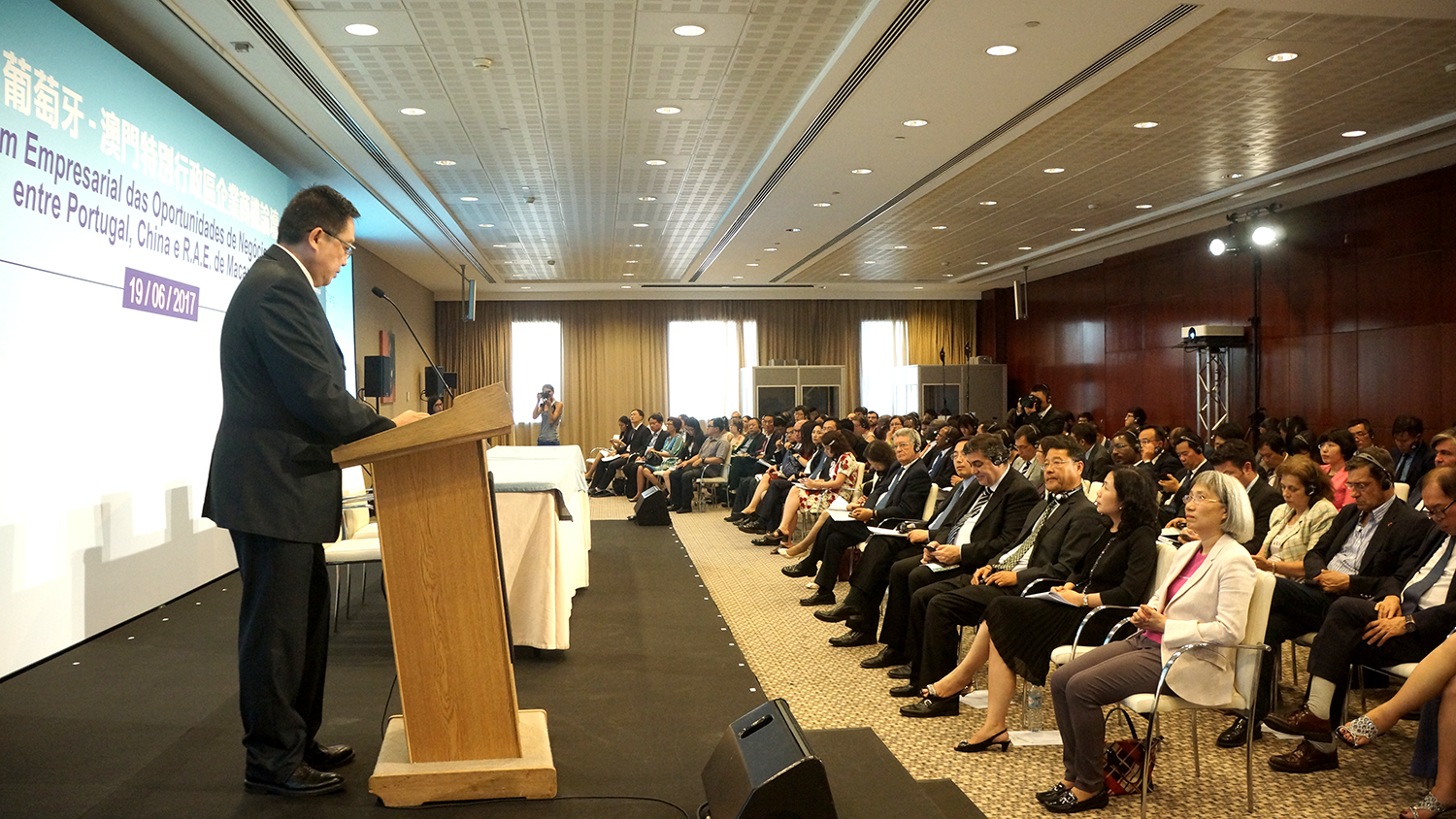 O referido Fórum foi inaugurado com os discursos de abertura sucessivamente proferidos pelo Secretário de Estado da Internacionalização de Portugal, Dr. Jorge Costa Oliveira, Embaixador da China em Portugal, Dr. Cai Run, Administrador Executivo da AICEP, Dr. António Silva, Vice-Presidente do CCPIT, Dr. Zhang Wei, Presidente do IPIM, Dr. Jackson Chang, e Subdirectora do Departamento para os Assuntos de Taiwan, Hong Kong e Macau do Ministério do Comércio da China, Dr.a Kang Wen. No discurso proferido pelo Dr. Jackson Chang, ele referiu que Macau está a implementar activamente as medidas de apoio, definidas pelo Governo Central da China, na construção de Macau como plataforma de cooperação entre a China e os Países de Língua Portuguesa, incluindo apoio na construção da Plataforma de Serviços Financeiros entre a China e os Países de Língua Portuguesa e do Centro de Liquidação em Renminbi para os Países Lusófonos, na construção do Complexo da Plataforma de Serviços para a Cooperação Comercial entre a China e os Países de Língua Portuguesa e na constituição da Federação Empresarial da China e dos Países de Língua Portuguesa, para além da inauguração da sede do Fundo da Cooperação para o Desenvolvimento entre a China e os Países de Língua Portuguesa, realizada em 1 de Junho em Macau, e do impulso à construção dos Três Centros, evidenciando o posicionamento e função de Macau como plataforma de serviços para a cooperação comercial entre a China e os Países de Língua Portuguesa, proporcionando oportunidades de negócios às empresas no âmbito da expansão do mercado do Interior da China, dos países de língua portuguesa e dos países abrangidos pela iniciativa “Uma Faixa, Uma Rota”.
