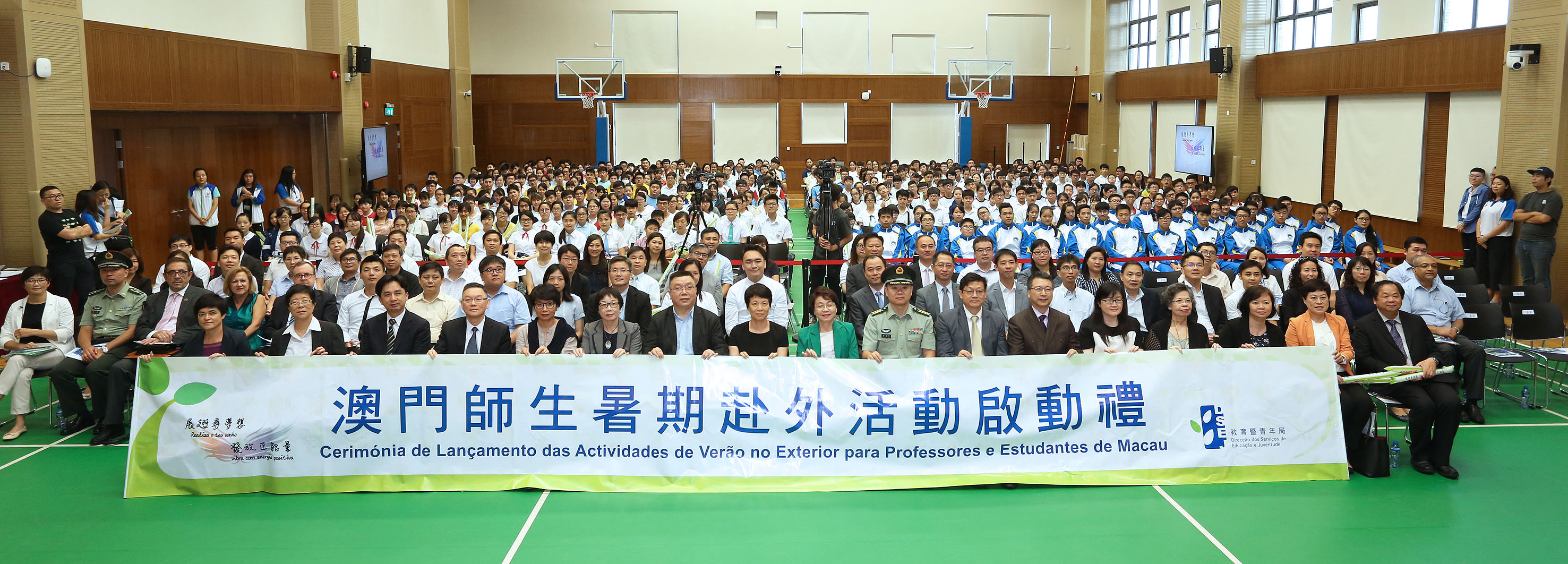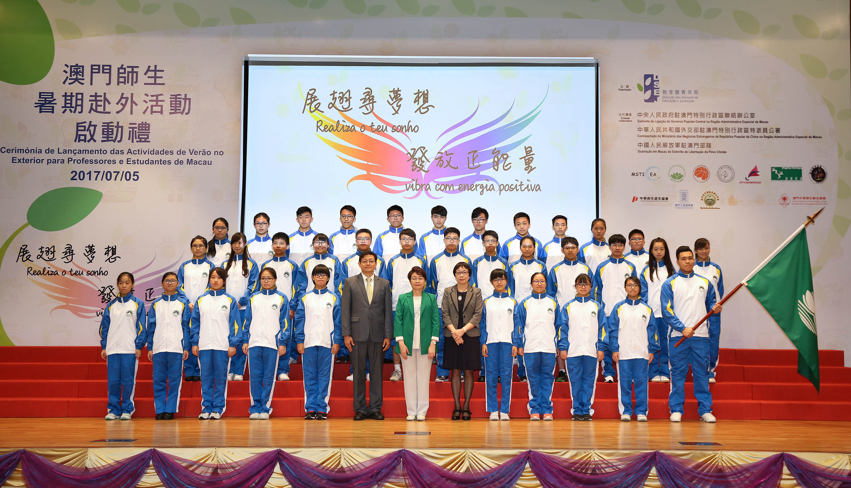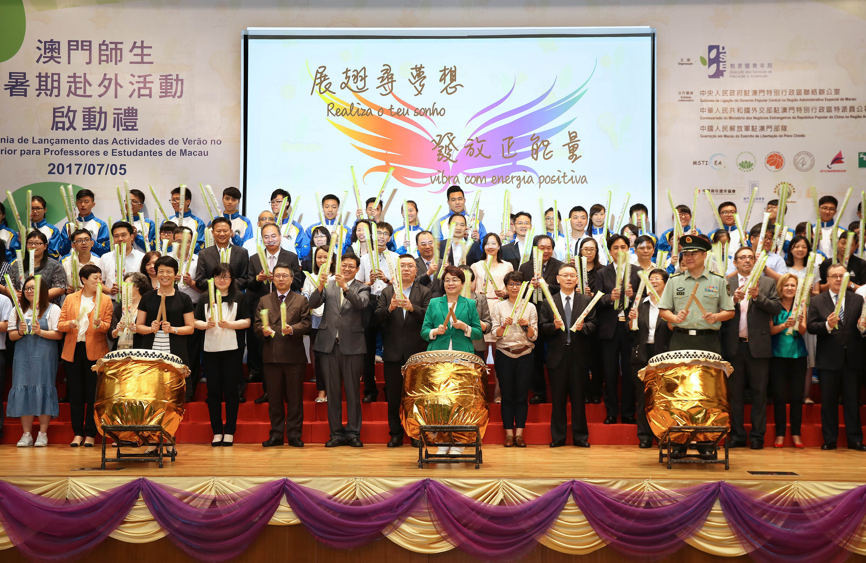 A “Cerimónia de Lançamento das Actividades de Verão no Exterior para Professores e Estudantes de Macau” teve lugar na tarde do dia 5 de Julho, no Auditório da Sessão Chinesa da Escola Keang Peng e contou com a presença da Directora da DSEJ, Leong Lai, da Directora do Departamento de Cultura e Educação do Gabinete de Ligação do Governo Popular Central na RAEM, Xu Ting, do representante da Guarnição em Macau do Exército de Libertação do Povo Chinês, Coronel Gao Zhijun, dos Subdirectores da DSEJ, Lou Pak Sang e Kuok Sio Lai e ainda dos vogais do Conselho de Educação para o Ensino Não Superior, do Conselho de Juventude e do Conselho Profissional do Pessoal Docente, do representante da Associação de Educação de Macau, do representante da Associação das Escolas Católicas de Macau, dos representantes das entidades colaboradoras e directores das escolas e delegações, envolvendo, ao todo, cerca de 600 professores e estudantes.
