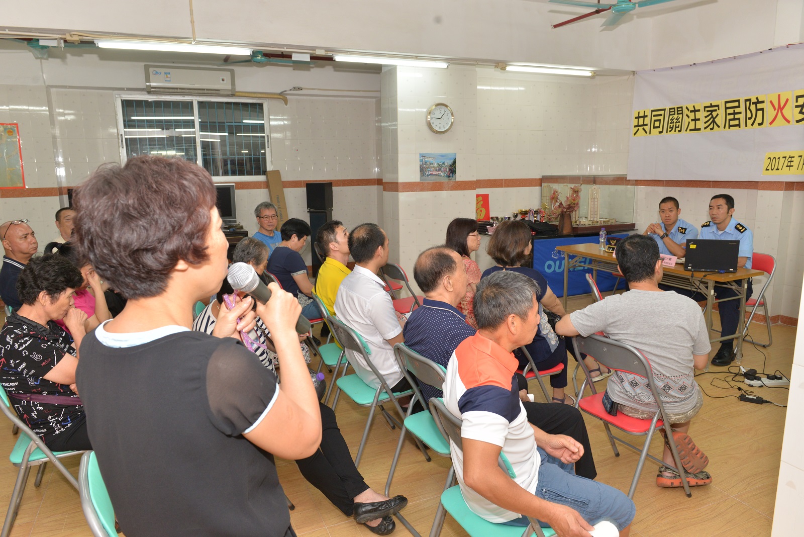 Com a ajuda da Associação de Beneficência e Assistência Mútua dos Moradores do Bairro da Ilha Verde da União Geral das Associações dos Moradores de Macau e dos chefes de segurança contra incêndios comunitária, organizámos a palestra e o colóquio de prevenção de incêndios na noite do dia 14 de Julho, que contou com a participação de cerca de 8 edifícios da Zona da Ilha Verde e 30 membros dos condóminos do edifício. Os conteúdos da palestra englobaram : explicação sobre os aspectos relativos à protecção contra incêndios que devem ter em consideração na administração predial, as crises principais de incêndio, conhecimento sobre as instalações e os equipamentos de prevenção de incêndios dos edifícios e as medidas de contingência em caso de incêndio junto dos membros dos condóminos do edifício. Depois, o nosso pessoal procedeu ao intercâmbio interactivo em conjunto com os membros participantes, para ouvir opiniões sobre segurança contra incêndios dos edifícios apresentadas pelos mesmos. Após esta actividade, a comunicação e a confiança mútua entre os membros dos condóminos do edifício e o CB foram intensificadas, com vista a elevar as suas consciências de prevenção contra o fogo. As tarefas de divulgação de protecção contra o fogo dos respectivos edifícios serão efectuadas continuamente.