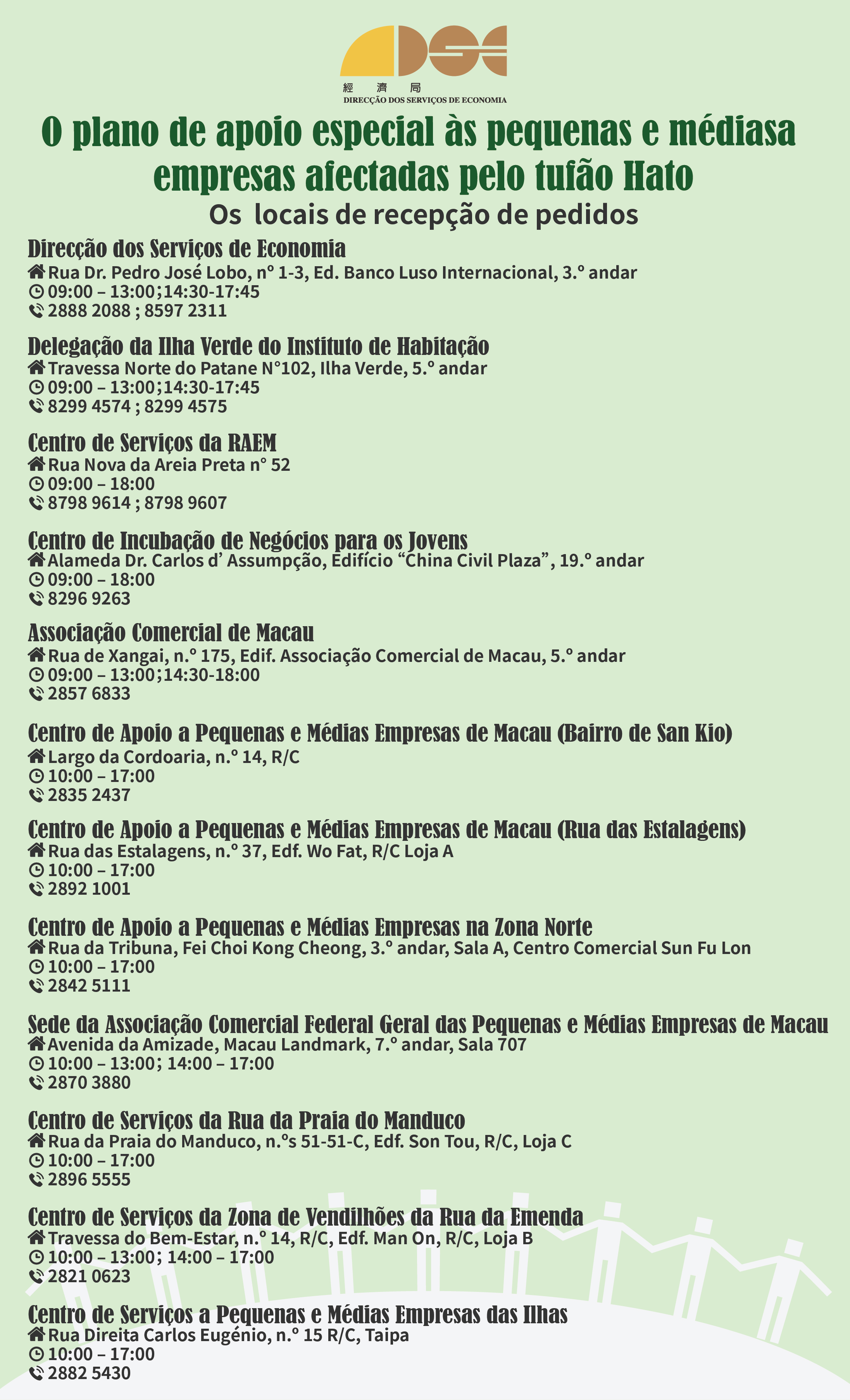 Para facilitar a submissão, pelos empresários, dos pedidos para as duas medidas de apoio, a partir de hoje (dia 28), foi adicionado mais um local de recepção de pedidos, situado na Delegação da Ilha Verde do Instituto de Habitação, pelo que os requerentes se podem dirigir ao 5.º andar da referida delegação, na Travessa Norte do Patane n.º 102, Ilha Verde, durante o horário de funcionamento. (Vide em anexo os endereços e horários de funcionamento dos 12 locais de recepção de pedidos). As referidas duas medidas especiais de apoio não têm data limite para entrega dos requerimentos, sendo as formalidades desses pedidos simples. As empresas candidatas devem apenas apresentar o boletim de candidatura devidamente preenchido, juntamente com a cópia do documento de identificação do empresário/sócios, bem como fotografias comprovativas dos prejuízos feitos pelo tufão (sendo dispensadas da apresentação das respectivas fotografias as empresas que se situem nas zonas afectadas pela inundação). Para as empresas que pretendam formular o pedido de empréstimos sem juros, é necessário apresentar a cópia do documento de identificação dos fiadores.