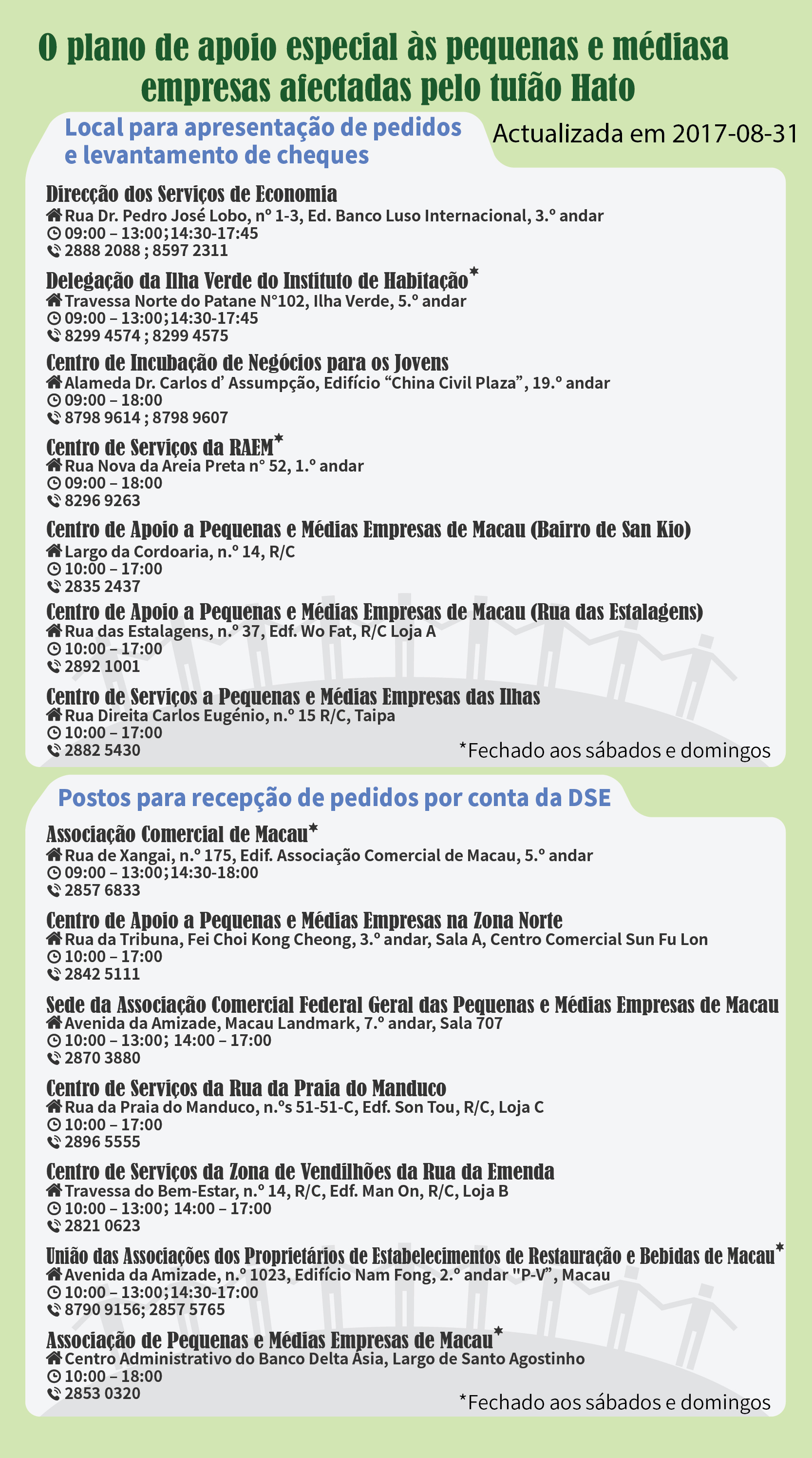 Para facilitar os empresários candidatos na apresentação de pedidos relacionados com as duas medidas de apoio especial às pequenas e médias empresas afectadas pelo tufão, a DSE acrescentou mais 2 locais para recepção de pedidos: 1. União das Associações dos Proprietários de Estabelecimentos de Restauração e Bebidas de Macau, situada na Avenida da Amizade, n.º 1023, Edifício Nam Fong, 2.º andar “P-V”; 2. Associação de Pequenas e Médias Empresas de Macau, situada no Largo de Santo Agostinho, Centro Administrativo do Banco Delta Asia. Actualmente, somam 14 locais para recepção de pedidos relacionados com medidas de apoio especial às pequenas e médias empresas, cujos endereços e horários de funcionamento encontram-se no quadro em anexo.