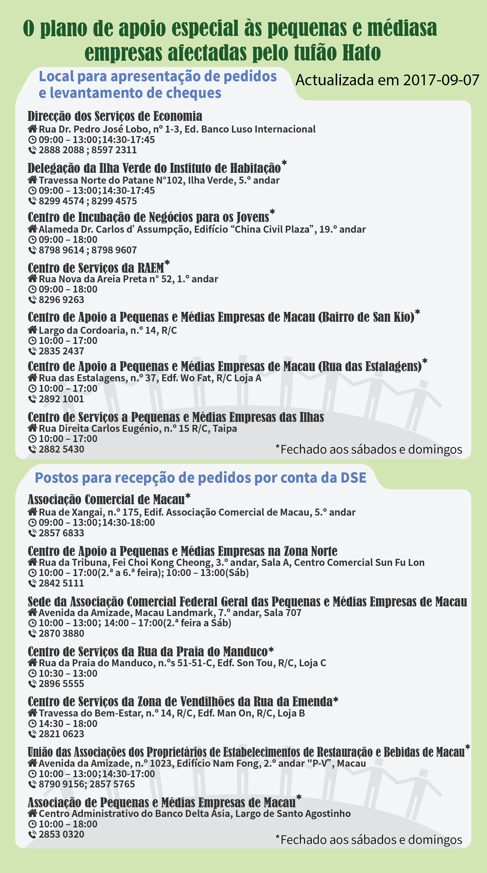 Para facilitar a submissão, pelas pequenas e médias empresas afectadas, dos pedidos relativos a duas medidas de apoio, a DSE e o posto de recepção de pedidos das Ilhas continuarão a estar abertos neste sábado (dia 9) e domingo (dia 10), enquanto os postos de recepção situados na Zona Norte e no NAPE estarão abertos neste sábado (dia 9) (vide a tabela abaixo sobre os endereços e horários de funcionamento).