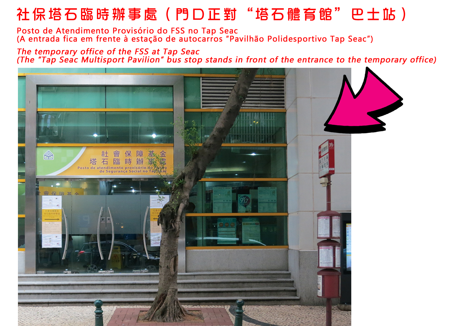 Para a realização de obras de remodelação, foi fechado o edifício das Instalações do FSS na freguesia de São Lázaro, sito na Rua Eduardo Marques. Os cidadãos que queiram tratar dos serviços do FSS nos balcões, tais como pagamento de contribuições, podem dirigir-se ao Posto de Atendimento Provisório no Tap Seac. A entrada do Posto fica em frente à paragem de autocarros “Pavilhão Polidesportivo Tap Seac”, pela qual passam os autocarros de carreiras n.os 2A, 7, 8, 8A, 9, 9A, 12, 18, 22, 25 e 25X. Além disso, os cidadãos ainda podem dirigir-se ao Centro de Serviços da RAEM na Areia Preta (Área de Segurança Social e Integração Laboral). Enquanto que os cidadãos que queiram tratar dos serviços relativos às contribuições, ainda podem dirigir-se às Instalações do FSS no Edf. China Civil Plaza no NAPE, 13.º andar.