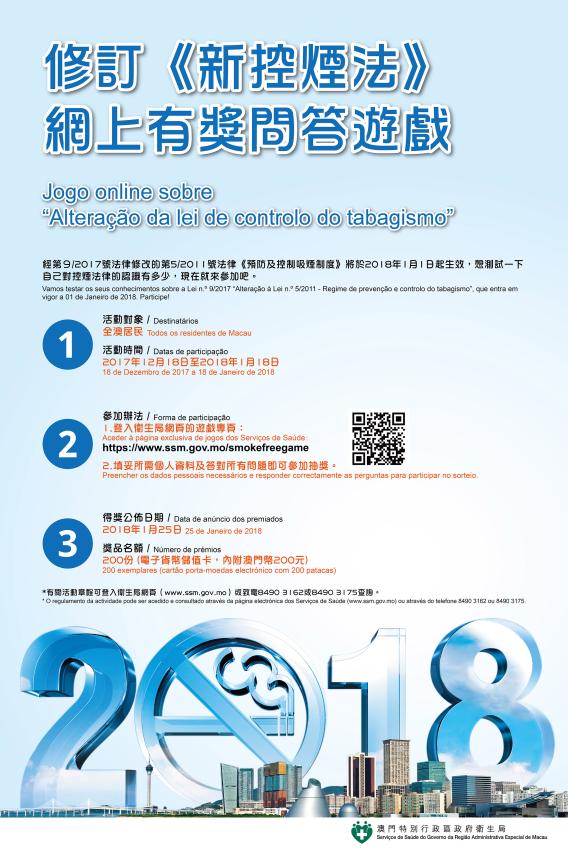 Os interessados em participar neste jogo, que teve inicio no dia 18 de Dezembro, devem aceder à página electrónica temática dos Serviços de Saúde denominada - “Jogo online sobre Alteração da lei de controlo do tabagismo” e quem conclua com sucesso as questões serão incluídos num sorteio de prémios. Vinte (20) vencedores receberão um cartão porta-moedas electrónico com um valor de MOP200.