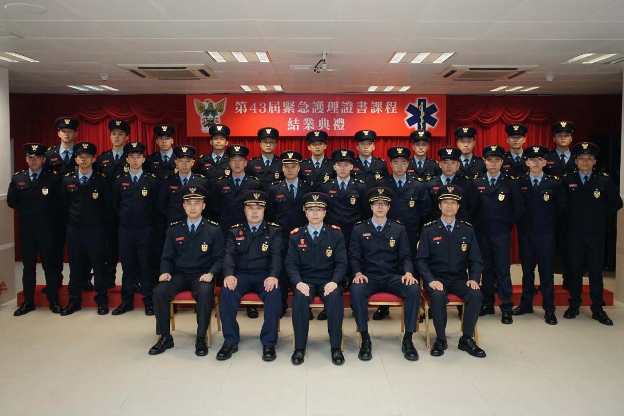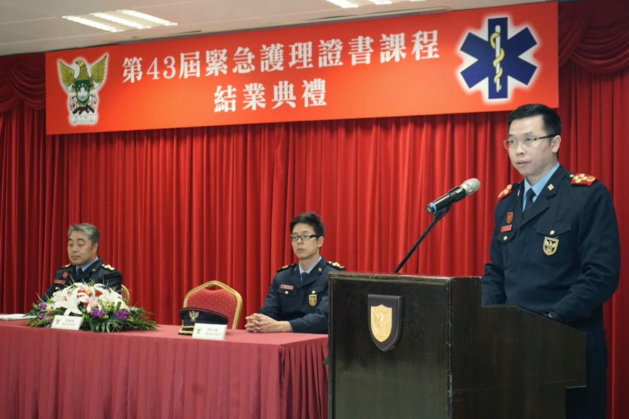 A Cerimónia de Encerramento do 43.º Curso de Enfermagem de Emergência foi realizada às 16h00 de hoje (dia 13 de Abril de 2018) no Posto Operacional da Areia Preta do Corpo de Bombeiros (CB). Na qual, o Comandante do CB, chefe-mor Leong Iok Sam presidiu à cerimónia, estimulou os finalistas a cumprirem sempre a deontologia profissional dos socorristas, manterem a vigilância e lembrarem-se das suas atribuições, para prestar serviços de emergência médica de qualidade aos cidadãos.