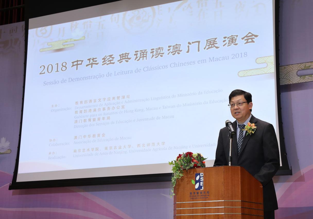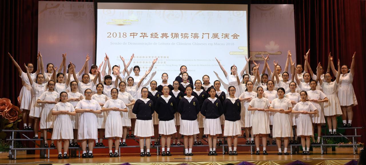 A “Sessão de Demonstração de Leitura de Clássicos Chineses em Macau 2018”, organizada pelo Departamento de Aplicação e Administração Linguística do Ministério da Educação da China, pelo Gabinete para os Assuntos de Hong Kong, Macau e Taiwan e pela Direcção dos Serviços de Educação e Juventude (DSEJ), em colaboração com a Associação de Educação de Macau e realizada pelas Universidades de Artes de Nanjing, Agrícola de Nanjing e Normal do Noroeste, teve lugar no dia 17 de Abril, pelas 15h, no auditório da Escola Keang Peng (Secção Primária). O evento contou com a presença dos seguintes convidados: inspectora do Departamento de Aplicação e Administração Linguística do Ministério da Educação da China, Lou Jing, director da DSEJ, Lou Pak Sang, chefe do Departamento da Educação e Assuntos de Juventude do Gabinete de Ligação do Governo Central na Região Administrativa Especial de Macau (RAEM), Xu Ting, subdirectores da DSEJ, Leong Vai Kei e Kong Chi Meng, Presidente da Associação de Educação de Macau, Ho Sio Kam, presidente e presidente do conselho executivo da Associação das Escolas Católicas de Macau, Chow Pak Fai e Vong Pio, presidente da Assembleia Geral da Associação Educativa da Função Pública de Macau, Cheang Wai Seng, responsáveis das escolas primárias e secundárias de Macau, bem como cerca de 500 alunos e docentes.