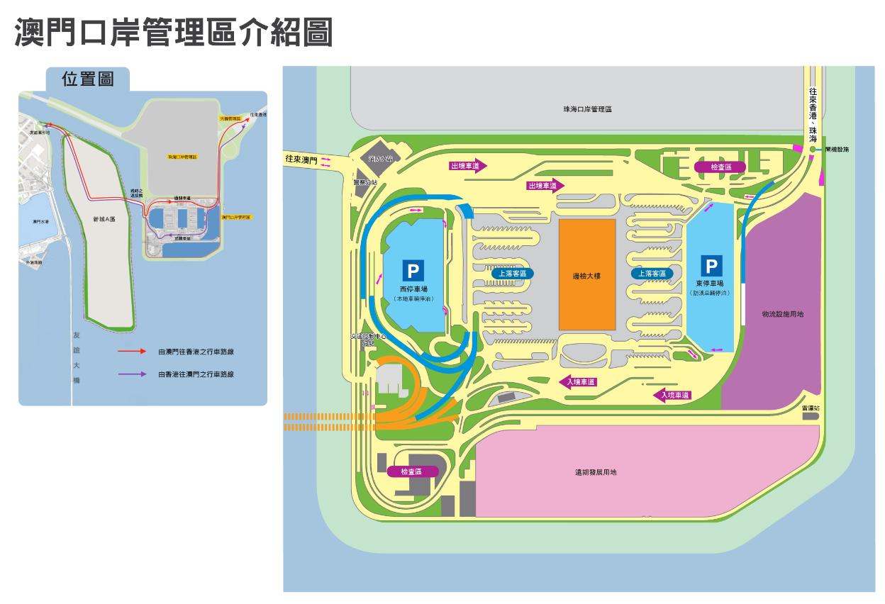 Tendo em conta que a ponte Hong Kong-Zhuhai-Macau está prestes a entrar em funcionamento, os serviços intervenientes estão empenhados em aperfeiçoar o planeamento de gestão da Zona de Administração, com vista a uma boa preparação para a entrada em funcionamento da referida obra de arte. No que se refere às instalações de trânsito, o auto-silo leste e o auto-silo oeste são destinados respectivamente aos visitantes e aos residentes locais. O auto-silo leste tem uma capacidade de 3 000 lugares para servir os automóveis ligeiros que chegam a Macau através da ponte. Os cidadãos e os visitantes que chegam à Zona de Administração, depois de tratar as formalidades de entrada, podem tomar no piso térreo (espaço para tomada e largada de passageiros) da zona oeste os meios de transporte preferidos para ir até ao centro urbano de Macau. A zona de tomada de passageiros dispõe de paragem de autocarros, praça de táxis e espaço para automóveis ligeiros e motociclos, paragem de veículos pesados de passageiros das agências de turismo, paragem de veículos pesados de passageiros dos hotéis, assim como paragem de veículos pesados de passageiros dos casinos, paragem de autocarros de turismo interurbanos e espaço para tomada de passageiros dos automóveis ligeiros autorizados a fazer viagem interurbana através da ponte e parque de estacionamento dos veículos pesados de passageiros.