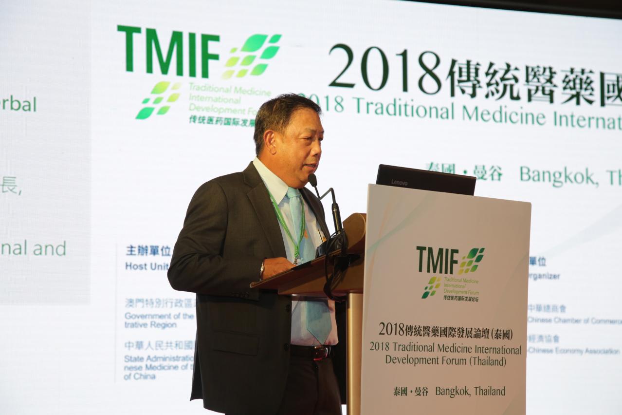 Organizado conjuntamente pelo Governo da Região Administrativa Especial de Macau (RAEM) e pela Administração Estatal da Medicina Tradicional Chinesa da República Popular da China, e coordenado pelo Parque Científico e Industrial de Medicina Tradicional Chinesa para a Cooperação entre Guangdong e Macau (adiante designado por "Parque") e pela Associação de Médicos de Medicina Tradicional Chinesa da Tailândia, o “Fórum Internacional de Desenvolvimento da Medicina Tradicional 2018 (Tailândia)” deu-se por concluído, com grande êxito, no passado dia 10 de Maio de 2018, em Bangkok, Tailândia. Na sessão do Fórum, o Director-Geral do Departamento da Medicina Tailandesa e Medicina Alternativa, Kiattibhoom Vongrachit, proferiu um discurso sobre as políticas e regulamentos inerentes à Medicina tradicional Tailandesa e aos produtos farmacêuticos, tendo abordado perante os convidados presentes, os detalhes da situação do desenvolvimento actual, as políticas de apoio e o rumo da reconversão e valorização da indústria de Medicina tradicional Tailandesa.