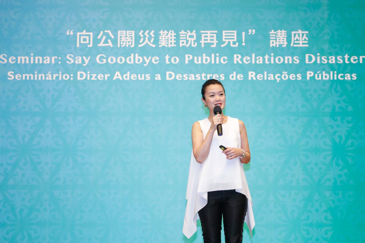 A Direcção dos Serviços de Turismo (DST) realizou o seminário sobre o tema em destaque, “Dizer Adeus a Desastres de Relações Públicas”, direccionado a profissionais da indústria turística e funcionários da DST. Para orientar o seminário, a DST convidou a famosa especialista em comunicação e relações públicas de Hong Kong, Akina Fong, que abordou a temática das relações públicas nas redes sociais, os potenciais desastres e possíveis soluções, entre outros aspectos, tendo a iniciativa atraído perto de 170 participantes. O seminário contou com a presença da Directora da DST, Maria Helena de Senna Fernandes, e do subdirector, Cheng Wai Tong, entre outros.