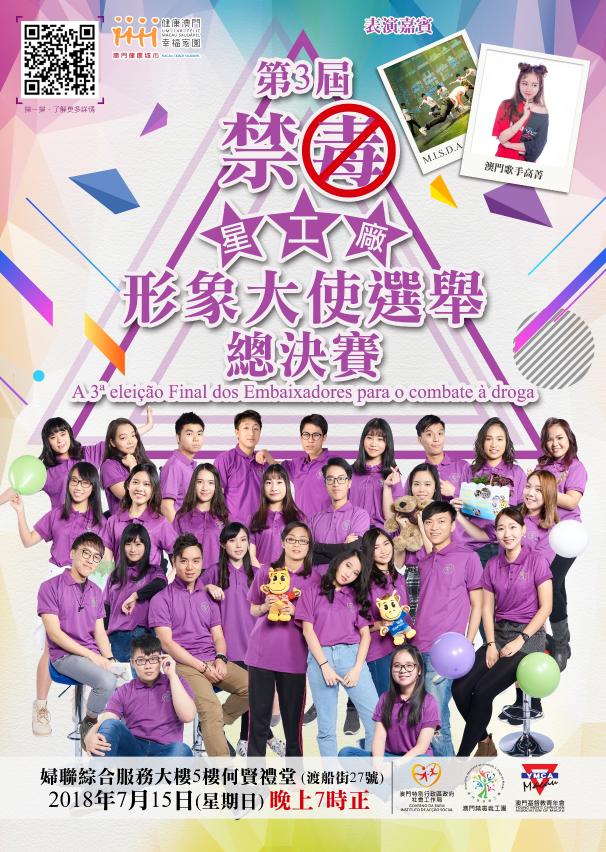 Para uma melhor promoção da mensagem de combate à droga e chamar a atenção para a questão das drogas, o Instituto de Acção Social, em conjunto com o Grupo de Voluntários de Macau de Apoio ao Combate à Droga e a Associação dos Jovens Cristãos de Macau, irá realizar, no Dia Internacional contra o Abuso e Tráfico Ilícito de Drogas, a «3.ª Eleição Final dos Embaixadores para o Combate à Droga». Seja bem-vinda a participação de todos os interessados.
