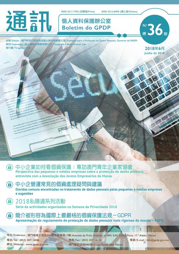 Está já disponível, com o n.º 36, a mais recente edição do Boletim do GPDP, publicada pelo Gabinete para a Protecção de Dados Pessoais. Esta edição desenvolve o tema da protecção da privacidade das pequenas e médias empresas (PME). Para além de conter um texto específico sobre as dúvidas comuns encontradas no tratamento de dados pessoais pelas PME e as respectivas sugestões, nesta edição, foi convidado um representante da Associação dos Jovens Empresários de Macau para apresentar a situação da protecção da privacidade das PME.