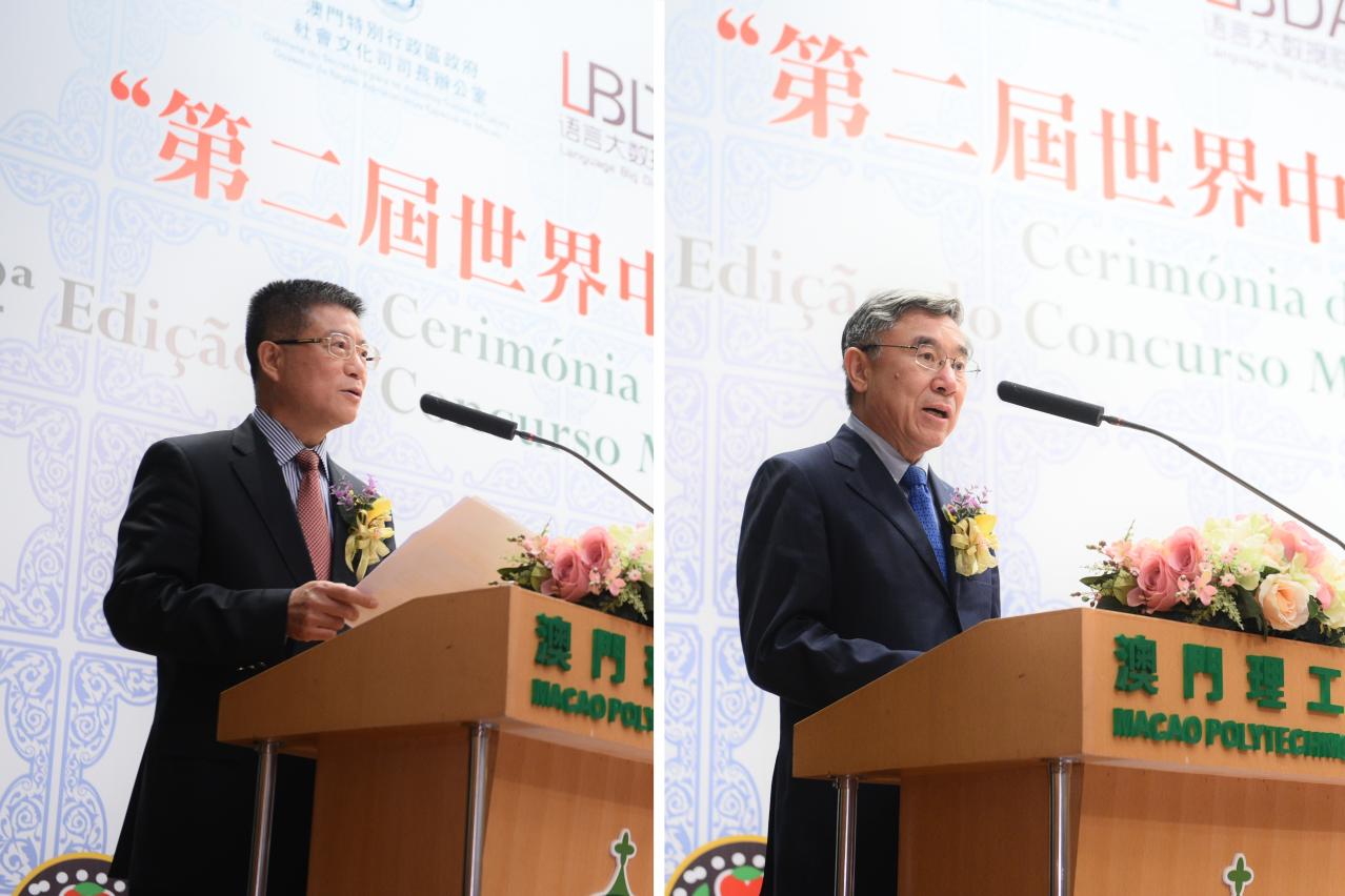 No seu discurso, o Sr. Prof. Dr. Lei Heong Iok, Presidente do Instituto Politécnico de Macau disse que, em comparação com o resultado da inscrição para a 1.ª Edição do Concurso Mundial de Tradução Chinês-Português, há muito mais candidatos que se candidataram, desta vez, à 2.ª Edição do Concurso Mundial de Tradução Chinês-Português. Inscreveram-se neste Concurso 117 equipas de 34 instituições de ensino superior internacionais. No final do discurso, este dirigiu as suas sinceras felicitações a todos os alunos concorrentes ao Concurso Mundial de Tradução e os seus orientadores, desejando boa sorte a todos alunos e professores participantes na próxima edição deste Concurso, desejando-lhes mais sucessos no futuro, para darem novos contributos ao desenvolvimento e prosperidade cultural sino-lusófona. Para além disso, o Sr. Prof. Lei Heong Iok referiu ainda que, para executar a iniciativa nacional “Uma Faixa, Uma Rota” e o planeamento estratégico do Governo da China, de construção da “Grande Baía de Guangdong, Hong Kong e Macau”, e dar mais contributos ao desenvolvimento de Macau como “Centro Internacional de Inovação Tecnológica” na “Grande Baía de Guangdong, Hong Kong e Macau”, o Instituto Politécnico de Macau aproveita as sua experiências ricas tanto no ensino da língua portuguesa, como no da tradução chinês-português, concentrando todos os recursos disponíveis não só lectivos, como também técnicos e tecnológicos nas áreas do Curso de Informática e do Curso de Inglês, etc., para realizar o Concurso Mundial de Tradução Chinês-Português, criando o Laboratório de Tradução Automática Português-Chinês-Inglês, estabelecendo o maior Corpus Paralelo Português-Chinês no Mundo, lançando ao mercado a excelente aplicação para telemóveis, de aprendizagem da língua portuguesa - “Diz lá!”, pesquisando e desenvolvendo com sucesso a Plataforma de Tradução Online Chinês-Português, baseada em tecnologia de rede neural, e o sistema auxiliar electrónico para tradução de documentos governamentais da RAEM, esforçando-se para resolver o “problema do Governo da RAEM”, que existe já há muito tempo na área de tradução de documentos: A tradução rápida de português para chinês e de chinês para português, de enorme quantidade de trabalhos de tradução. Os resultados dos projectos acima referidos são reconhecidos e apreciados por muitos serviços públicos e entidades profissionais tanto de Macau e do Interior da China, como dos países lusófonos, nomeadamente, pelo sector de tradução profissional.