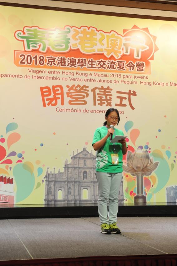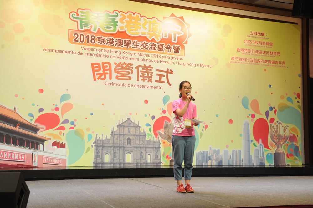 A cerimónia de encerramento do acampamento realizou-se no dia 30 de Julho no Centro de Convenções e Entretenimento da Torre de Macau e contou com a presença dos seguintes convidados: a Directora Substituta da DSEJ, Leong Vai Kei, o membro do Conselho de Educação de Pequim, Wang Dingdong, a Directora Principal de Educação dos Serviços de Educação da RAEHK, Lau Kar Shin, a adjunta do Chefe de Divisão do Departamento de Educação e Assuntos de Juventude do Gabinete de Ligação do Governo Popular Central na RAEM, Qu Xiaoyan, a Directora do Gabinete do Reitor da Universidade de Macau, Wong Kei, etc. Os representantes dos alunos das três regiões referiram, no seu discurso, na cerimónia de encerramento, que durante a participação neste acampamento tiveram a oportunidade de realizar um intercâmbio com alunos de outras regiões, partilharam as suas experiências de vida e atitude de aprendizagem, deram a conhecer diferentes modos de vida e afirmaram que aprenderam muito e que o acampamento lhes deixou impressões profundas e inesquecíveis, ampliaram os seus horizontes, aprofundaram o conhecimento sobre a cultura das três regiões, assim como estabeleceram laços de amizade profundos. Para além disso, os alunos das três regiões apresentaram exibição teatral, canção, leque de Tai Chi e dança, etc., em conjunto, demonstrando os seus talentos e representando diferentes características culturais. Por fim, os docentes e alunos de Pequim, Hong Kong e Macau participaram numa exibição de dança e o acampamento terminou com grande sucesso.