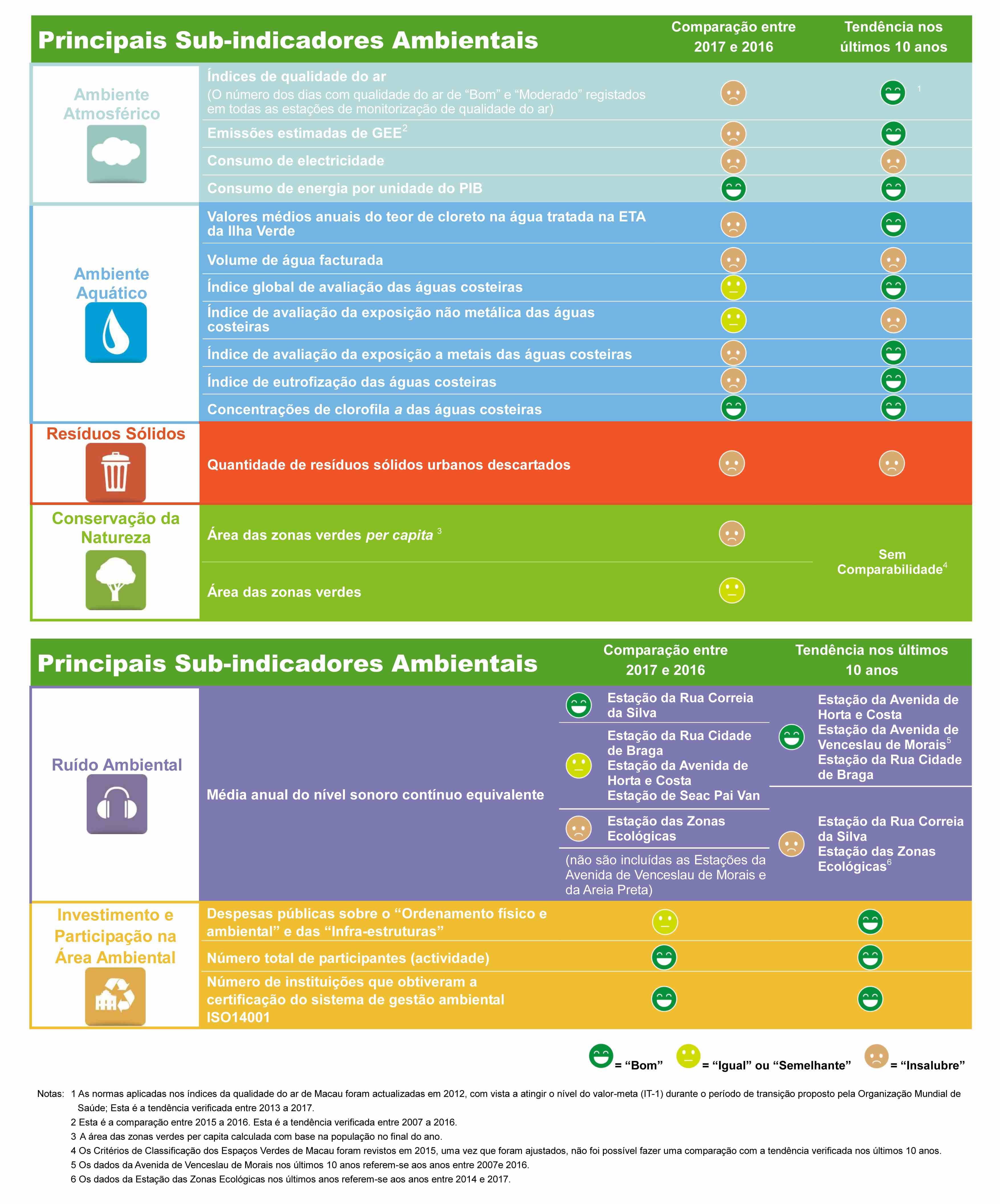 Em termos de ambiente atmosférico, conforme os registos de todas as estações de monitorização da qualidade do ar em 2017, o número dos dias classificados como “Bom” e “Moderado” ultrapassou 92% no número total de dias de monitorização, verificando-se uma descida face a 2016. Na estação ambiental (Taipa) registou-se um dia com nível classificado como “muito insalubre” e os índices de qualidade do ar tiveram melhores resultados em Junho e Julho e foram menos satisfatórios em Dezembro. Em 2017 o O3 foi o principal poluente atmosférico de Macau. Ao mesmo tempo, as concentrações médias anuais de PM10 e PM2,5 respeitam as normas, cujas tendências foram idênticas à tendência global da Rede de Monitorização da Qualidade do Ar da Região do Delta do Pérolas (Guangdong, Hong Kong e Macau). De acordo com as análises sobre os valores estimados de emissões de poluentes atmosféricos e de GEE de Macau, os respectivos valores de PM2.5, PM10, PTS e COVNM em 2016 foram sucessivamente mais reduzidos do que em 2015, mas devido ao aumento da produção de energia eléctrica e do consumo de combustíveis nos transportes, entre outros factores, os valores estimados de emissões dos restantes poluentes atmosféricos e dos GEE (excepto CH4) aumentaram em 2016 relativamente a 2015.