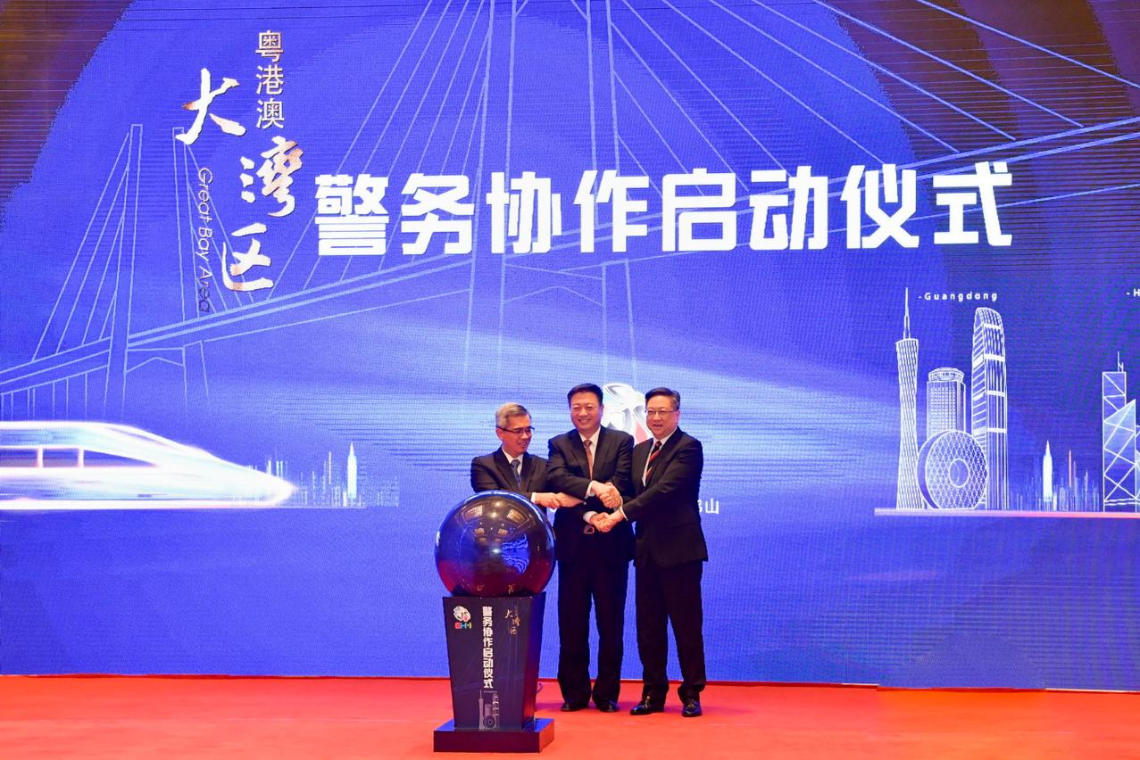 Seguidamente, os senhores Vice-governador Li Chunsheng, Comandante Stephen Lo e Secretário Wong Sio Chak presidiram a cerimónia de activação da “Cooperação Policial da Região da Grande Baía Guangdong-Hong Kong-Macau”.