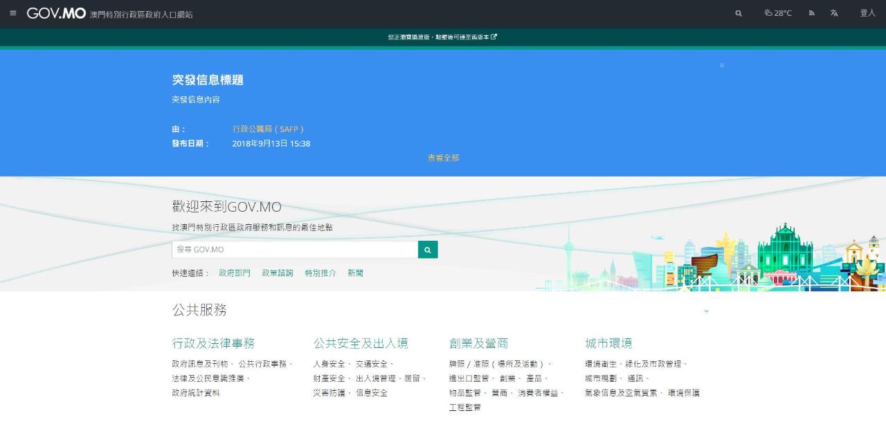Devido à passagem da tempestade tropical “Mangkhut”, a Direcção dos Serviços de Administração e Função Pública irá, segundo o plano de emergência do Governo da RAEM, activar o mecanismo de “divulgação de informações especiais sobre os serviços públicos do Portal do Governo”, divulgando de forma centralizada ao público e aos trabalhadores dos Serviços Públicos as informações de emergência sobre o funcionamento dos Serviços Públicos e os serviços fornecidos durante a tempestade tropical, reforçando a uniformização da divulgação de informações em situações de emergência.