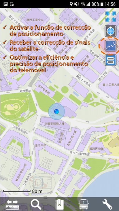 Presentemente, a Direcção dos Serviços de Cartografia e Cadastro (DSCC) possui quatro estações de referência de posicionamento por satélite que apoia ao mesmo tempo os sinais do Sistema de Navegação por Satélite Beidou, GPS dos Estados Unidos, GLONASS da Rússia, com serviço que cobre toda a zona da RAEM, apoia efectivamente a vários trabalhos de levantamento topográfico e levantamento em projectos de engenharia. Para aprofundar ainda mais a aplicação, a DSCC e a Universidade Politécnica de Hong Kong conseguiram introduzir a técnica das estações de referência de posicionamento por satélite com sucesso na aplicação móvel da nova versão 2.5 do “Macau GeoGuide”, o utente basta activar a função de “correcção de posicionamento”, o mesmo recebe logo sinais de correcção de posicionamento de sistemas acima referidas, com vista ao melhoramento do nível de precisão de posicionamento do telemóvel dentro de 5 metros, o resultado é mais significativo em ambientes sem acesso ao WiFi.