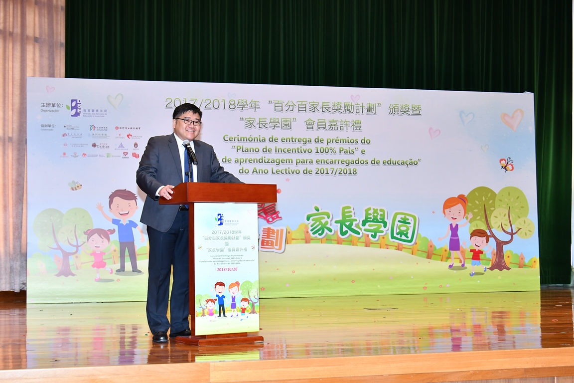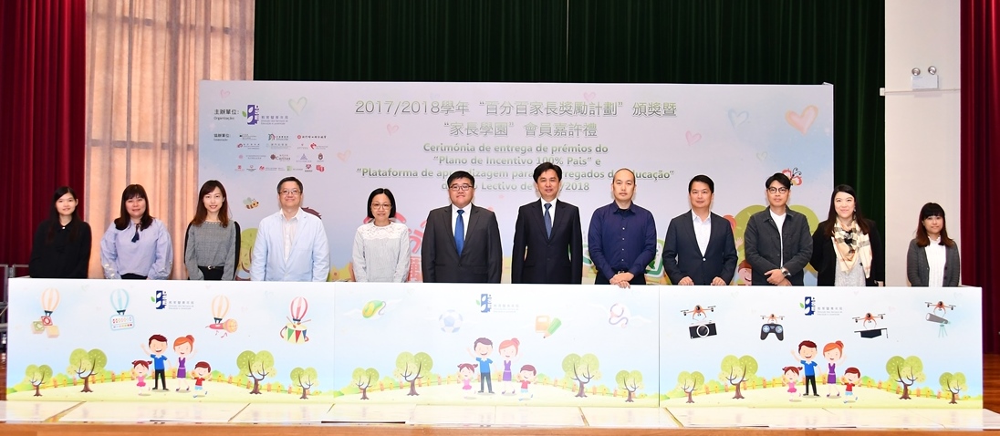 Para distinguir os encarregados de educação que participaram, de forma entusiástica e positiva, na educação parental e actividades para a família, a DSEJ realizou a cerimónia de entrega dos prémios do “Plano de Incentivo 100% Pais” e dos louvores da “Plataforma de Aprendizagem para Encarregados de Educação” do ano lectivo de 2017/2018, bem como a cerimónia de lançamento do “Plano de Incentivo 100% Pais” do ano lectivo de 2018/2019, no dia 28 de Outubro, pelas 10:30, no auditório da Escola da Associação Geral das Mulheres de Macau, com a presença do subdirector substituto da DSEJ, Kong Ngai, o chefe do Departamento de Estudos e Recursos Educativos da DSEJ, Wong Kin Mou, o chefe da Divisão de Gestão de Recursos Humanos da Direcção dos Serviços de Correios e Telecomunicações, Yuen Vai Chi, e o chefe do Departamento de Exibições e de Educação do Centro de Ciência de Macau, Leong Si Chong, e de mais 60 representantes de instituições educativas e associações.