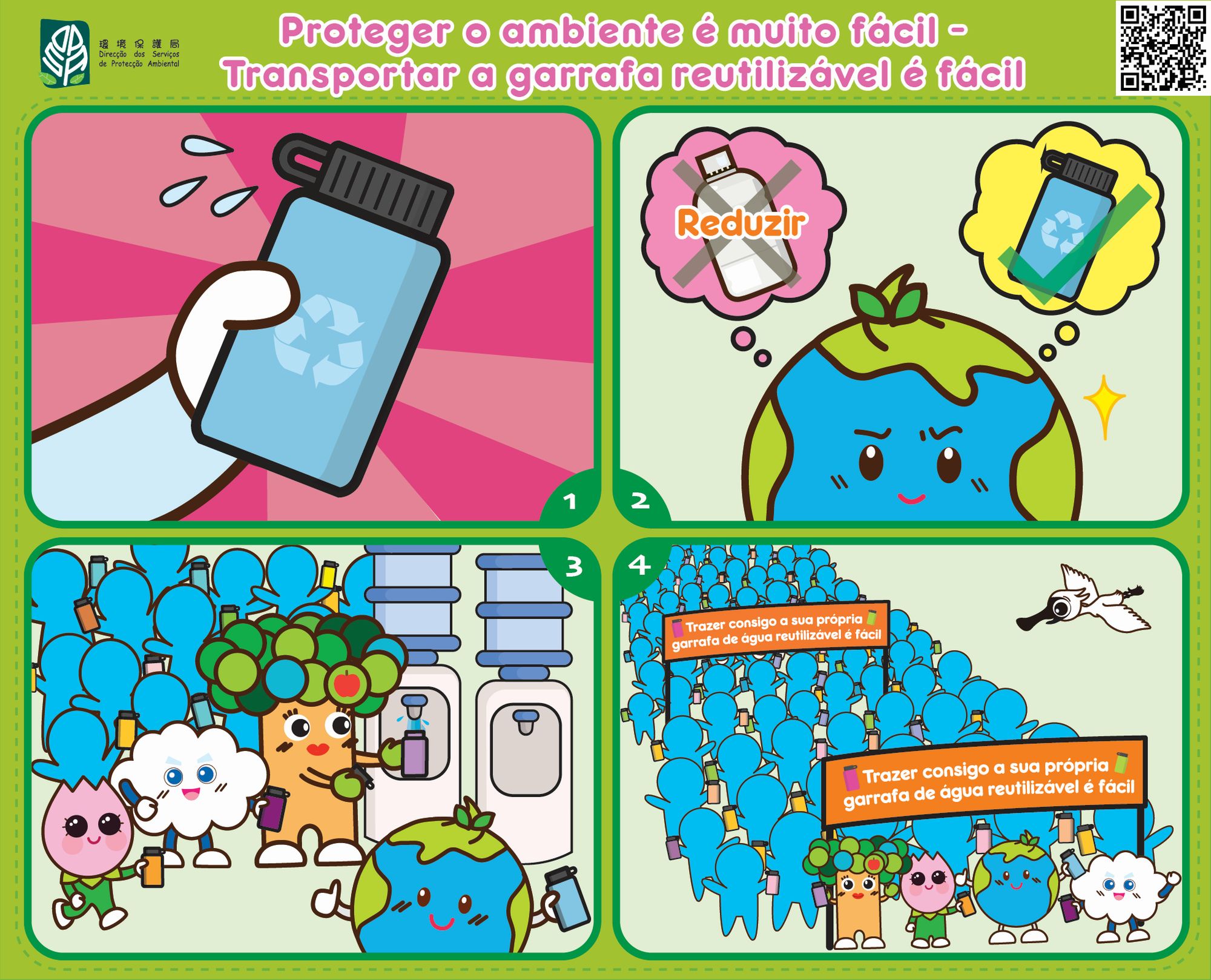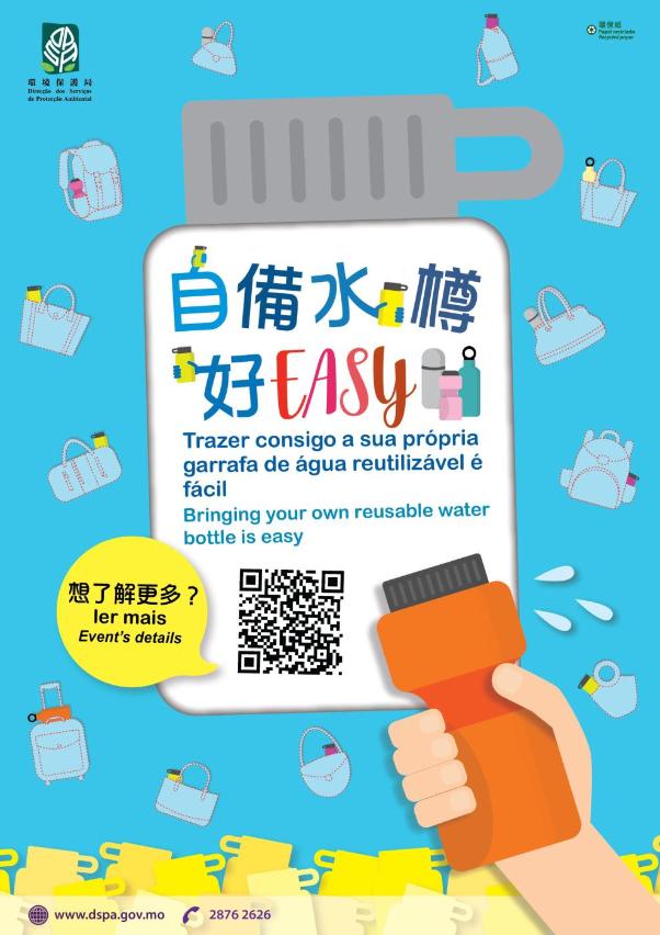 Os referidos trabalhos (incluindo localização de bebedouros, actividade “A vida sem plástico é muito fácil” e respectivas instruções, etc.) estarão disponíveis para consulta no website da DSPA (www.dspa.gov.mo). São bem-vindos o apoio e a participação dos sectores sociais, promovendo assim a redução do uso de plástico.