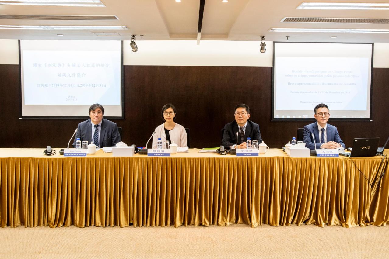 Os representantes da DSAJ realizaram, no dia 30 de Novembro, pelas 16:00, uma conferência de imprensa na sala polivalente do 6.º andar do edifício CNAC, na Alameda Dr. Carlos D’Assumpção. O director, Dr. Liu Dexue, a subdirectora, Dr.ª Carmen Maria Chung, o Chefe do Departamento de Produção Legislativa, Dr. Fong Peng Kit, e o jurista da Divisão de Estudo do Sistema Jurídico, Dr. Nuno Pereira, todos da DSAJ estiveram presentes nesta conferência, com vista a apresentar, explicar e dar respostas às questões relativas à consulta pública sobre a revisão das disposições do Código Penal sobre os crimes cometidos pelas pessoas colectivas.